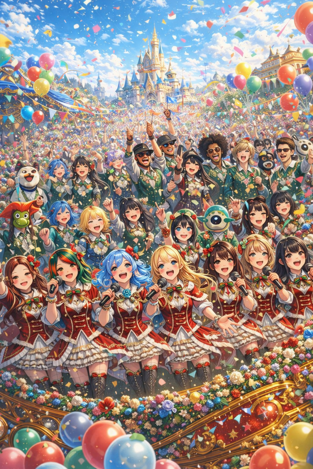 [STYLE: theme-park parade pop, cinematic pop, uplifting festival anthem, big choir, bright brass, marching snare, glockenspiel, strings, sparkling synths, handclaps, crowd chants, call-and-response, key change finale]