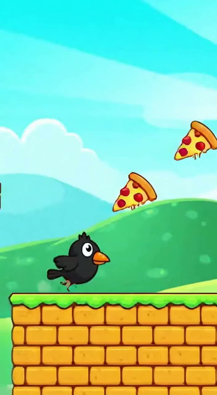 Upbeat and playful video game music for a colorful 2D side-scrolling platformer, Fast and bouncy rhythm with a cheerful groove, around 140–150 BPM, Bright chiptune leads blended with modern synth layers, Punchy electronic drums, snappy snares, and tight rhythmic percussion, Bouncy bassline that feels jumpy and energetic, Melody should feel adventurous and lighthearted, matching a cute crow character jumping across platforms, Short, catchy phrases that loop well for gameplay, Fun, whimsical vibe with a slightly quirky tone, fitting a world where pizza slices are collectibles and snails are power-ups, Clean mix, clear melody, high energy, seamless looping background game music, No vocals, instrumental only