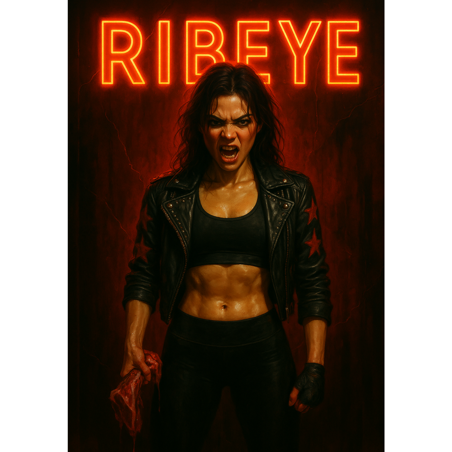 Grunge + industrial + cyberpunk hybrid, ~5 min runtime, slow-mid tempo (70–75 BPM), minor key, Sultry, frustrated female vocal — verses half-whispered with smoky intimacy, pre-chorus tense and tight, choruses raw and cathartic, Dirty distorted bass, jagged guitars, industrial percussion hits like machinery, pulsing cyberpunk synths and glitch textures woven throughout, Structure: extended 45s synth/bass intro with industrial hits, Verse 1–Pre–Chorus–Chorus, then drawn-out 1 min instrumental break (bass groove + glitchy synth layers), Verse 2–Pre–Chorus–Chorus, Extended stripped bridge (bass + kick + whispered/snapped ad-libs: “Not tonight!”, “Stay hungry!”, “Breathe it in…”), building back in distorted layers, Final Chorus repeated twice with gang shouts, exploding into a long 60s noisy outro/ride-out — feedback, glitching synths, crashing drums, ad-libs (“Goddamn!”, “Starved but standing!”, “Ribeye waits!”), Mood: sultry, feral, cybernetic frustration released in sweat and noise