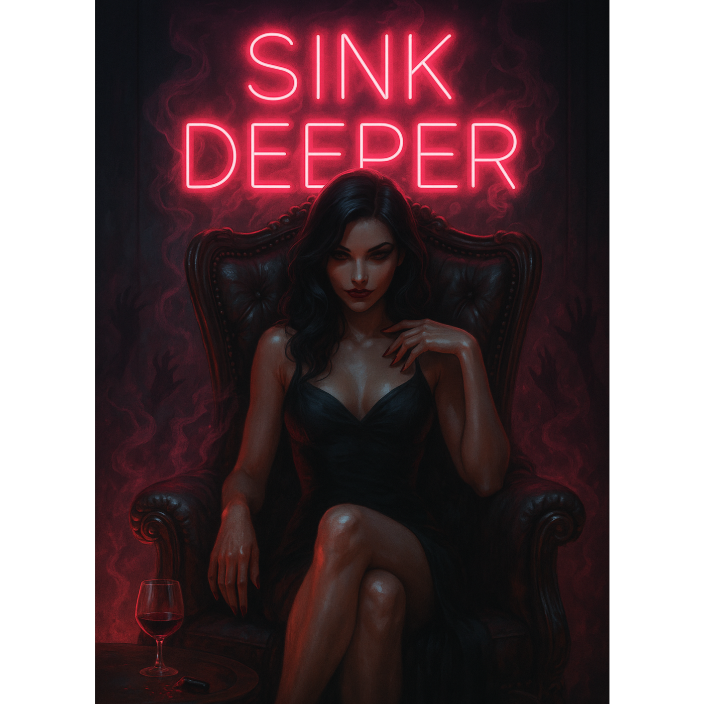 Dark grunge + sultry darkwave fusion with hypnotic, seductive energy, Tempo 75–80 BPM, Slithering bassline, smooth distorted bass, smoky reverb-soaked guitar slides, Slow, heavy industrial drums with lots of space between hits, Whispery backing vocals in verses, almost chant-like in the bridge, Occasional synth textures like smoke or breath, Verses: low, intimate, almost whispered, sparse instrumentation letting the bass carry tension, Pre-choruses: build with heartbeat kick and subtle guitar harmonics, pulling toward chorus, Choruses: lush, layered, commanding yet sultry, harmonies/whispers doubling “sink” and “deeper, ” Bridge: stripped back, ritual-like, echoing vocals, Final chorus and outro: massive, hypnotic, loop “sink, sink deeper” mantra-style with layered, surrounding vocals