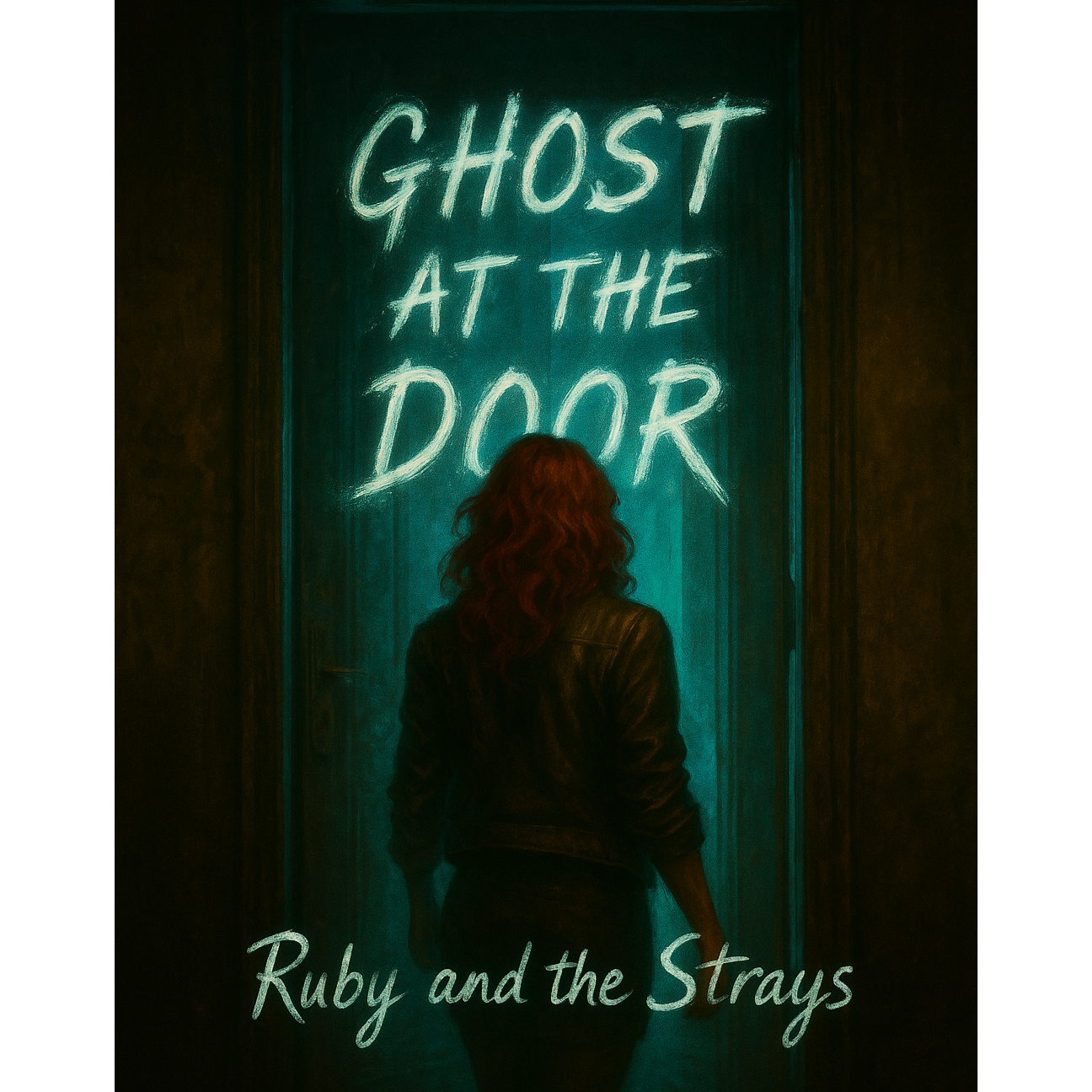 Darkwave + grunge fusion with cyberpunk edge, Smoky, brooding verses over pulsing bass and atmospheric synth pads, building into explosive, distorted guitar choruses, Mood is haunting, tense, emotionally raw — like a confession whispered into a neon-lit alley before it bursts into a scream, Low, sultry female vocal delivery in the verses — almost spoken, with smoky grit, Pre-chorus lifts slightly, tense and breathless, then chorus is full belt: ragged, emotional, cathartic, Add light reverb/echo for a ghostly feel, Background vocals in the chorus should echo “ghost at the door” like a haunting refrain, Verses: Deep, minimal bassline + muted, reverb-heavy drums + atmospheric synth textures (static, hums, echoes), Pre-Chorus: Add tension with synth riser, faint heartbeat-like kick drum, Chorus: Distorted grunge guitars crash in, bigger live-sounding drums, layered harmonies, Bridge: Strip back to bass and synth, whispery vocal delivery, then huge final chorus drop, Tempo: 80–85 BPM