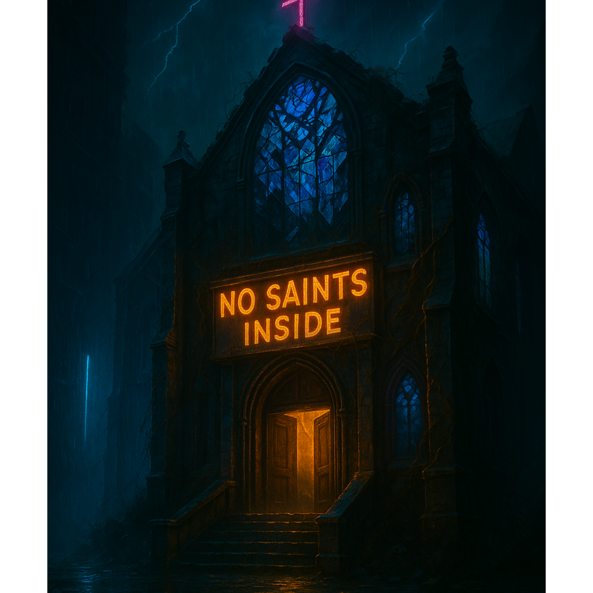 Grunge + industrial + darkwave hybrid, ~80 BPM, E minor, Smoky female vocal — verses whispered like confession, choruses defiant and soaring, bridge half-spoken then erupting, Deep distorted bass, metallic drums that hit like machinery, glitch-static textures and broken-radio samples, Darkwave synth pads shimmer under grunge guitars; pre-chorus builds with organ drones and distant choir, Bridge pares down to heartbeat percussion and haunted guitar before the last chorus explodes, The mix should feel like a sermon broadcast through a broken cathedral speaker — faith and fury twisted together, Cinematic, heavy, intimate, feral