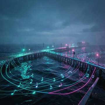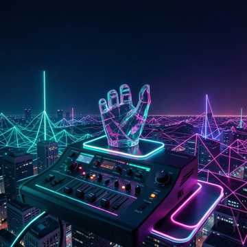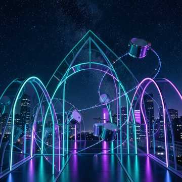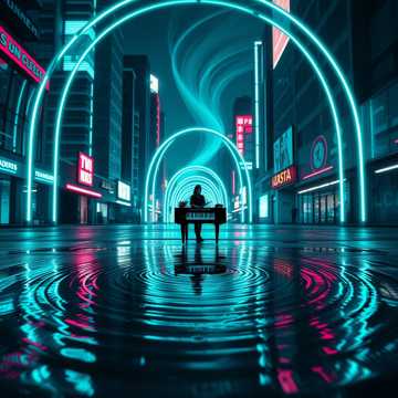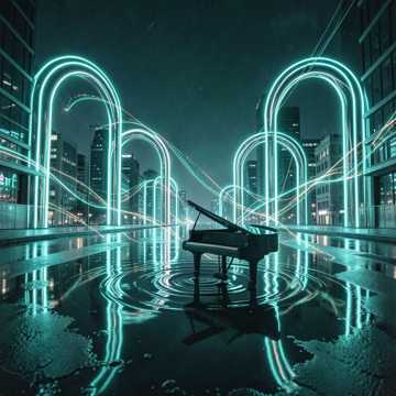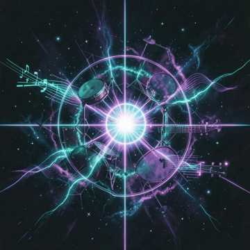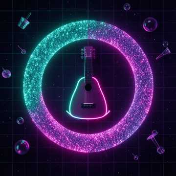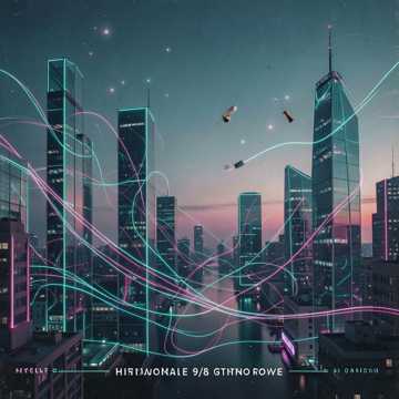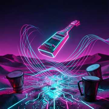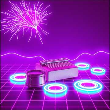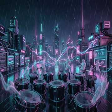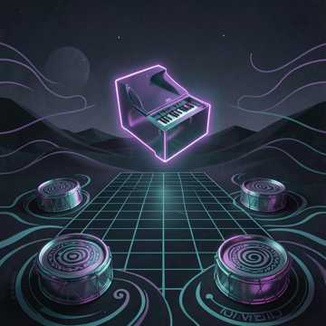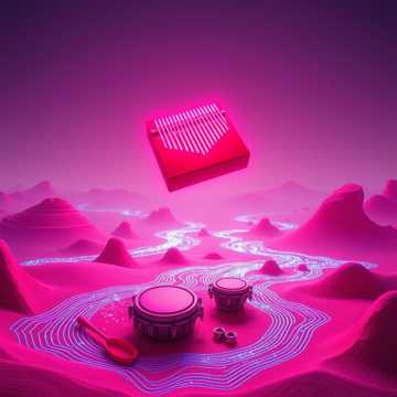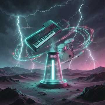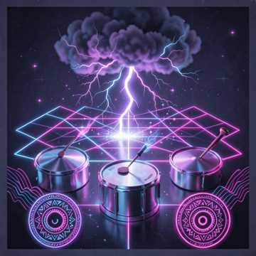 Shimmering synthwave - Hard Rock blend with Hip Hop-Elemements, danceable mid-tempo drive with side-chained bass and lush pads, Kalimba and thumb piano sparkle on top, interlocking with complex arpeggios, Finger bells, clamp ring, tambourine, derbouka, and tabla add intricate polyrhythms and shakers that dance around the groove —folded into the mix like another instrument, Energetic but hypnotic arc: tight intro build, wide shimmering midsection, then a final lift into a swirling, Prominente Perkussion, Ungerade Metren und Polyrhythmen, Dynamische Ghost Notes, Tribale Grooves, Überlagerung: 4:3 und 5:4 Polyrhythmen über das 9/8, Kick: Pulsierend in Vierteln, Snare: Betonung auf 2 & 4 des 9/8, Hi-Hat: 16tel-Triolen, die sich gegen das 9/8 verschieben
