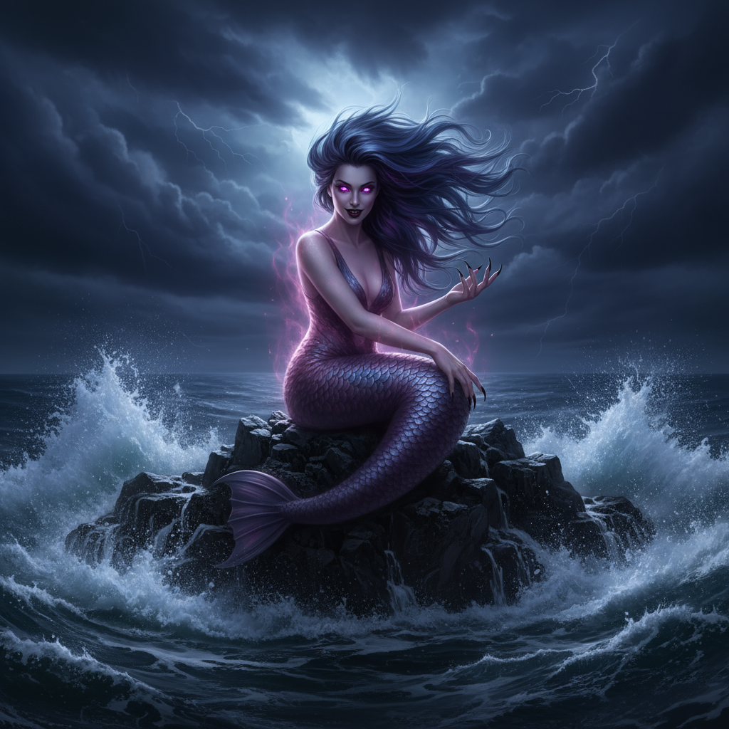 Dark folk horror sea shanty with supernatural elements, blending traditional maritime storytelling with predatory, seductive undertones; an eerie folk ballad meets cursed lullaby, progressing from innocent and welcoming to nightmarish and horrifying, Seductive female vocals lead, sweet and inviting at first, then gradually distorted and monstrous with reversed and otherworldly processing to evoke inhuman sirens; call-and-response sections and ethereal harmonies sound beautiful but wrong, Slow to moderate sea shanty rhythm, 70–80 BPM, with ceremonial, ritualistic pacing that allows narrative tension to build, Instruments include acoustic guitar, fiddle, concertina, and bodhrán, processed with dark ambient effects; creaking ships, ocean waves, wind through rigging, distant whale calls, and reversed audio create a haunting underwater/cavern acoustics; minor keys throughout, emphasizing suspense and supernatural dread, cursed/reversed vocalizations creating otherworldly siren effect