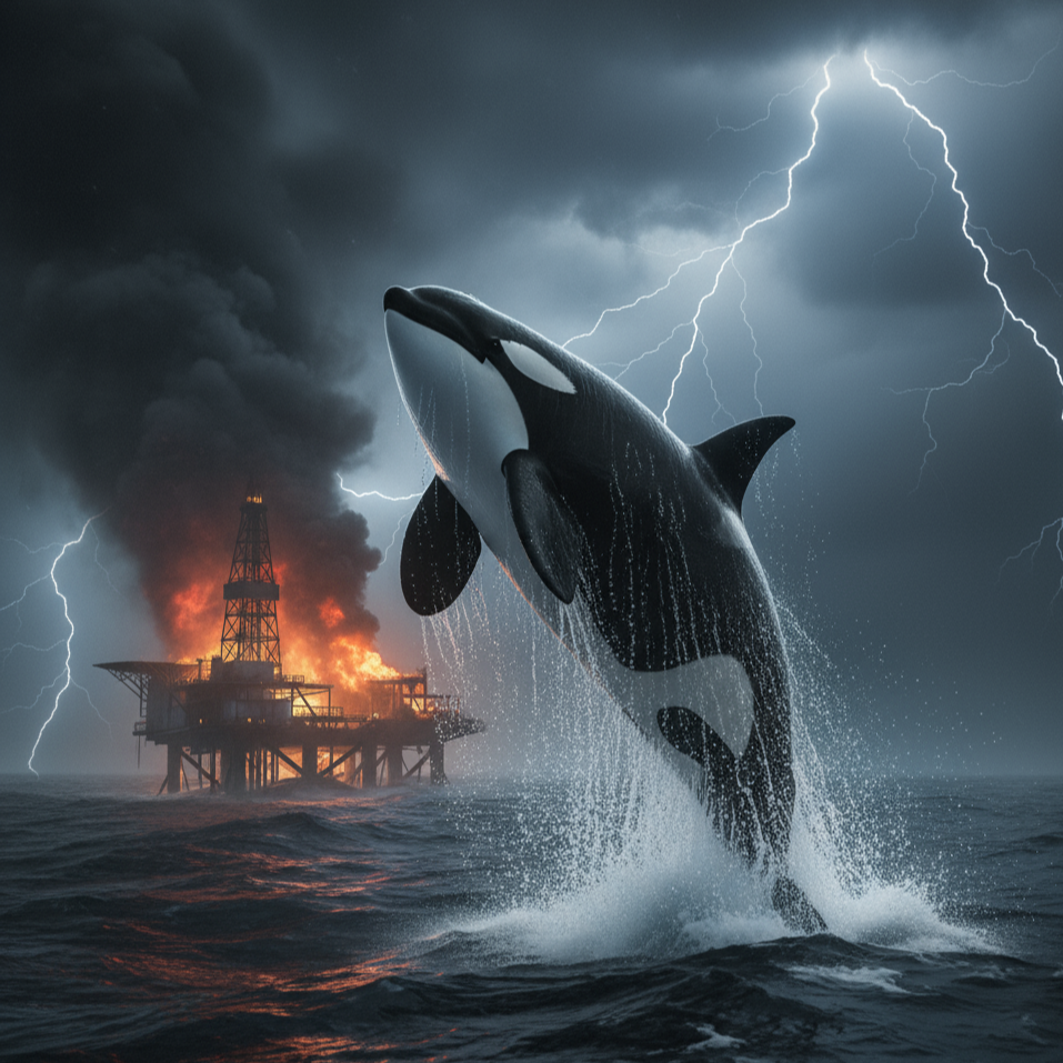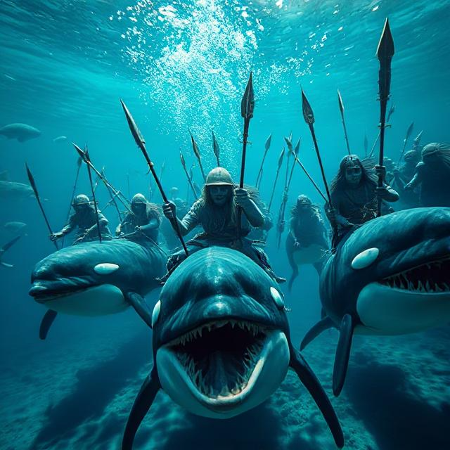 Dark cinematic gangster rap meets trap anthem with deep 808 bass and militant drums, Nautical warlord energy—deep-sea warriors riding orcas into battle, Aggressive male vocals with autotune, vocoder, metallic resonance dominate verses: booming 808s, kick-snare patterns, pluck melodies, underwater ambience, Minimal melodies keep vocals centered, Choruses explode with layered synth brass, low strings, hi-hats, massive low-end, arena-filling chant hooks, Bridges feature distorted choir pads, filtered triplets, menacing samples, dark swells, Reverse cymbals and bass dropouts build drops, Layered claps, rapid hi-hats, hype ad-libs boost energy, Intense, militant, oceanic vibe blends drill/trap aggression with cinematic brass and aquatic design, Relentless drive builds to anthemic finale: full drop, layered choirs, bass glides, wide ad-libs trailing to reverb, dark trumpet melody carrying throughout the song