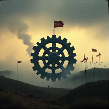 Dark fantasy movie soundtrack moody indie art rock post punk steampunk atmospheric with industrial sfx cog whirring and steam sounds with explosions and human sighs deep bass riff power hard rock power chords powerful drums deep husky male vocals orchestral chorus