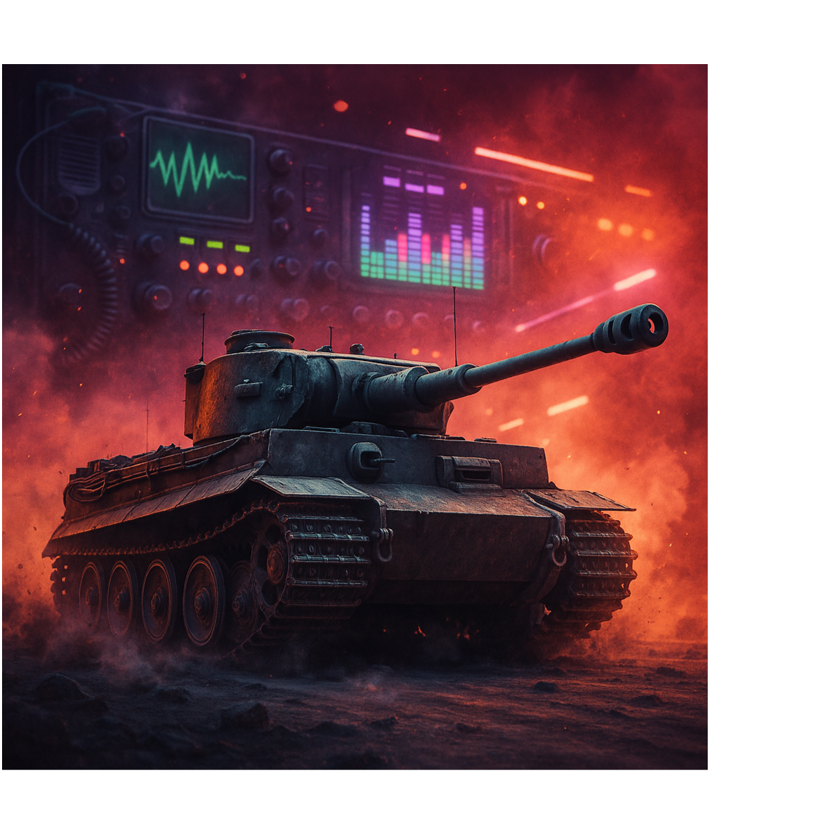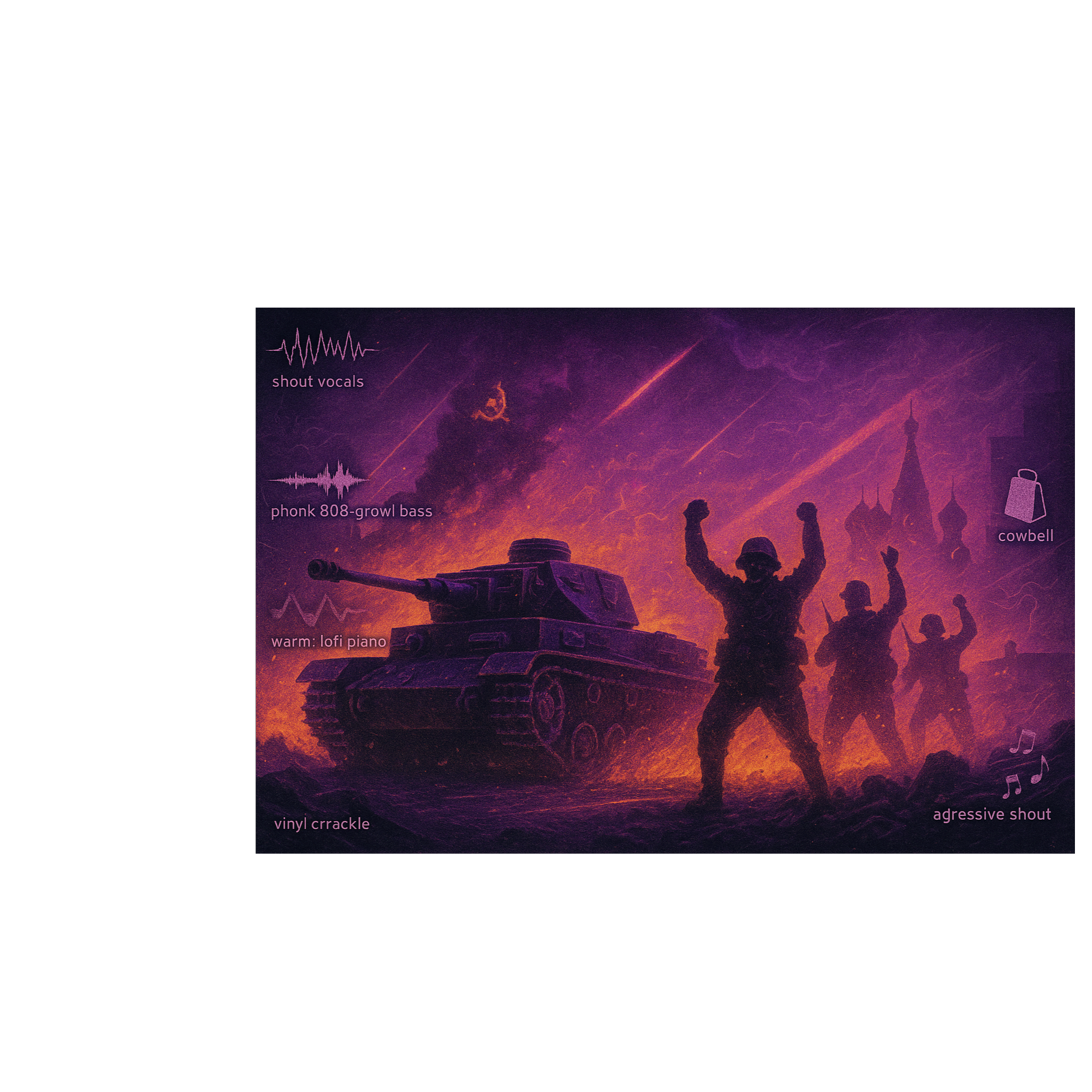 Melodic Lo-Fi Phonk × Russian Hardbass × Gabber hybrid, 160 BPM; massive, rolling “German Panzer” energy – heavy distorted kick + phonk 808 growl bass that pushes forward like steel treads, Off-beat cowbells, metallic claps, and slow-swing hats, Melodic Lo-Fi pads and sad piano motifs under brutal gabber lead – contrast of beauty and power, Arrangement: cinematic intro → slow build → rolling drop → short ambient break → final panzer drop with melodic hook, Use radio chatter FX and tank engine rumble for texture, Vocals in Russian chant-style, rhythmic and commanding, Focus: unstoppable momentum + melodic rage