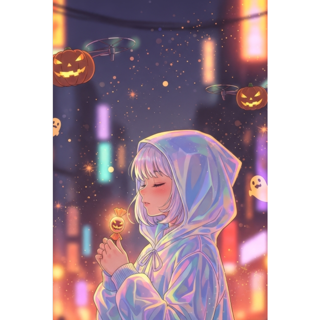 Create a 2:30 track at BPM 160 blending minimal techno precision, Detroit techno depth, and Japanese techno melody, performed by girl vocals, The sound should be futuristic yet cute â a mix of sharp rhythm and warm emotion, Use a tight 4/4 beat with deep kicks and metallic hi-hats, Basslines should pulse hypnotically, carrying a fast, fluid energy, Layer minimal synth arps, bright percussive tones, and 8-bit or city-pop inspired textures, Add airy pads or plucky stabs for contrast, The girl vocals should sound bright, expressive, and mischievous, fitting a magical anime-like Halloween world, Use delay and reverb to make them float above the beat, glowing inside a neon cityscape, The overall tone should be playful, cinematic, and high-speed â merging Japanese rhythm, Detroit groove, and minimal precision