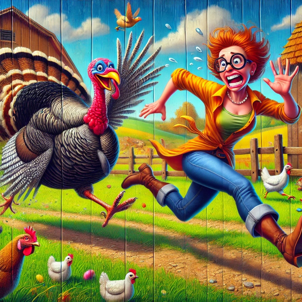 "Upbeat, fast-paced country/bluegrass track with playful banjos, stomping bass, and energetic Female Vocals, Include silly sound effects like clucks and gobbles for a fun, comedic hillbilly vibe, "