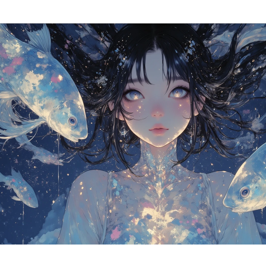 Dreamy lo-fi pop at 95 BPM with jazzy extended electric piano chords, airy synth pads, and soft sub-bass, Vinyl crackle and playful percussive details blend with watery textures: underwater reverb, phaser, and low-pass filtering create a submerged, muffled soundscape, Bubble-like synth sparkles and reverse notes evoke drifting currents, Female vocals shift from intimate whispers to brighter harmonies, sometimes processed with underwater effects for surreal depth, Mood is whimsical yet melancholic, floating between tears and laughter in an aquatic dreamworld, ‑魚座なので, ‑泣いておきます