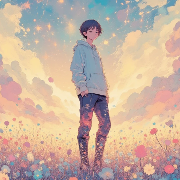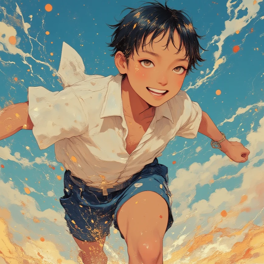 Upbeat, high-energy J-Rock with a fast tempo (150 BPM), evoking youthful motion and summer freedom, Features crisp electric guitars, steady bass, and clean, tight 8-beat drumming, Verses use light textures with clean tones, ambient summer sounds (cicadas, breeze), and wide spatial mixing for freshness, Strategic use of “ma” (space) between phrases enhances clarity and flow, Rhythms include subtle syncopation, echoing breezes and footsteps, Percussion highlights: dry, punchy snare and bright, airy cymbals that sparkle in stereo, Choruses are wide and anthemic, with unison shouts like “Hashire!” supporting an emotional yet uplifting male vocal, The contrast between light verses and explosive choruses captures the fleeting heat of summer and the unstoppable drive of youth, Inspired by Aries-like impulses, the song radiates motion, camaraderie, and the clear sky of adolescence