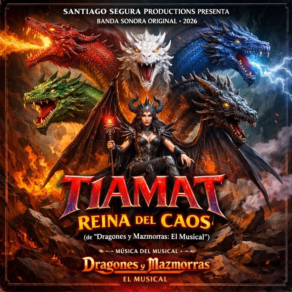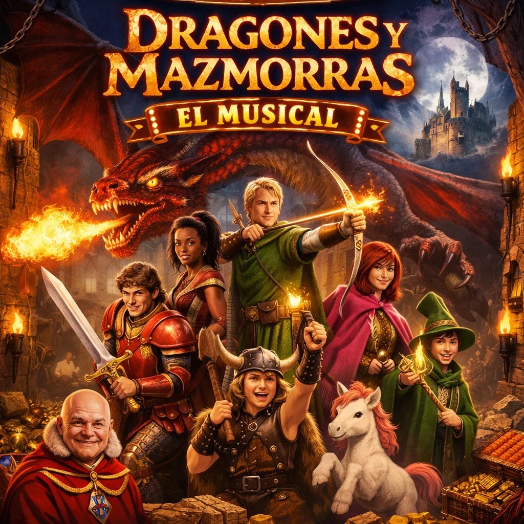 symphonic musical, cast recording, Spanish theatrical pop, Broadway ensemble vocals, orchestral pit brass, pizzicato strings, timpani rolls, electric guitar stabs, walking bass, live drum kit, minor key march, call and response, cavern reverb, tape saturation, wide stereo choir, dramatic build, key change lift, mischievous adventure
