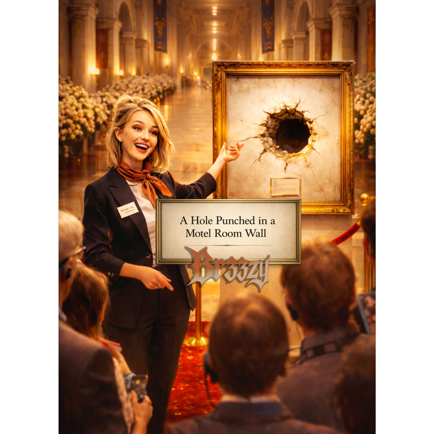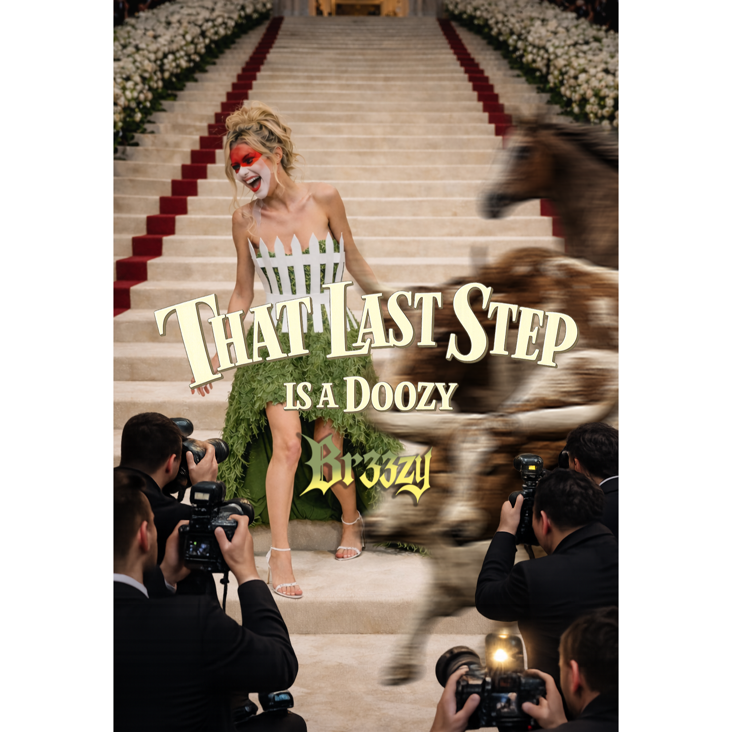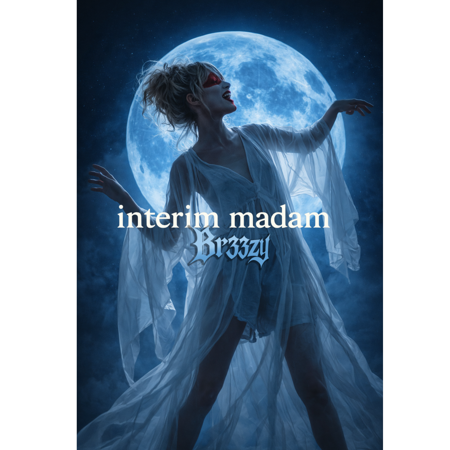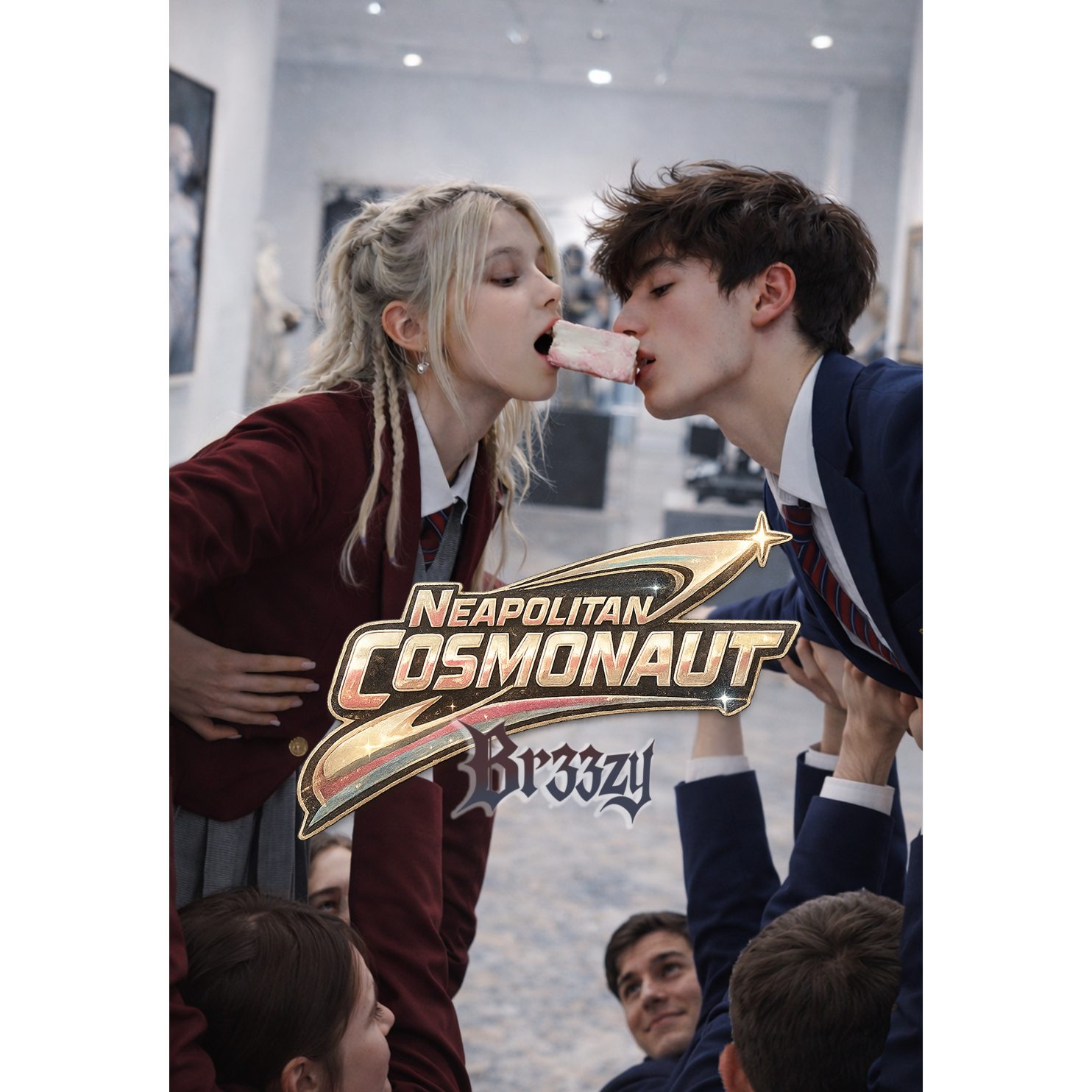 Art-pop / art-rock track, Alto female vocal, conversational and controlled, slightly nasal with bite—cool, knowing, and unflinching, Delivery is dry and rhythmic, more spoken than sung at times, with sharp phrasing and intentional restraint; no belting, no emoting, no catharsis, Occasional group shouts sound bored and corrective, not celebratory, Guitars are angular and precise, drums tight with sudden dropouts, Harmony moves sideways in an E-minor pitch set with sharp color tones and brief intrusions, Mid-song the music destabilizes—off-grid chord shifts, tritone pressure, slight detuning—then snaps back cold, Feminine swagger, coiled danger, Clean, modern production, End abruptly, mid-gesture, Snobby wine mom gang vocals