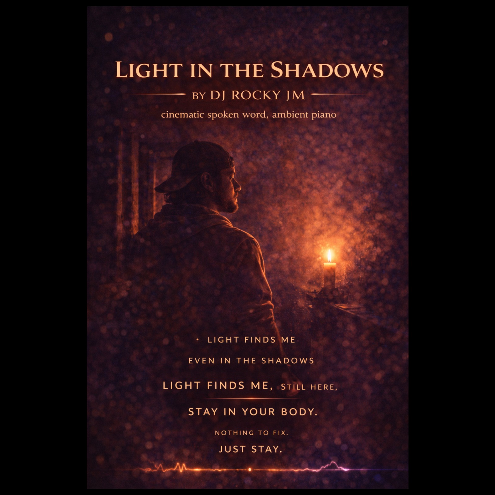 A poetic spoken word piece about light appearing inside the darkest places of life, Minimal instrumentation: deep piano chords, atmospheric textures, distant cello, The voice should sound reflective and contemplative, like someone reading a personal poem written during a difficult season, The piece describes walking through shadows of doubt, fear, and loss — then slowly noticing small moments of light breaking through, Repeating line throughout the piece: