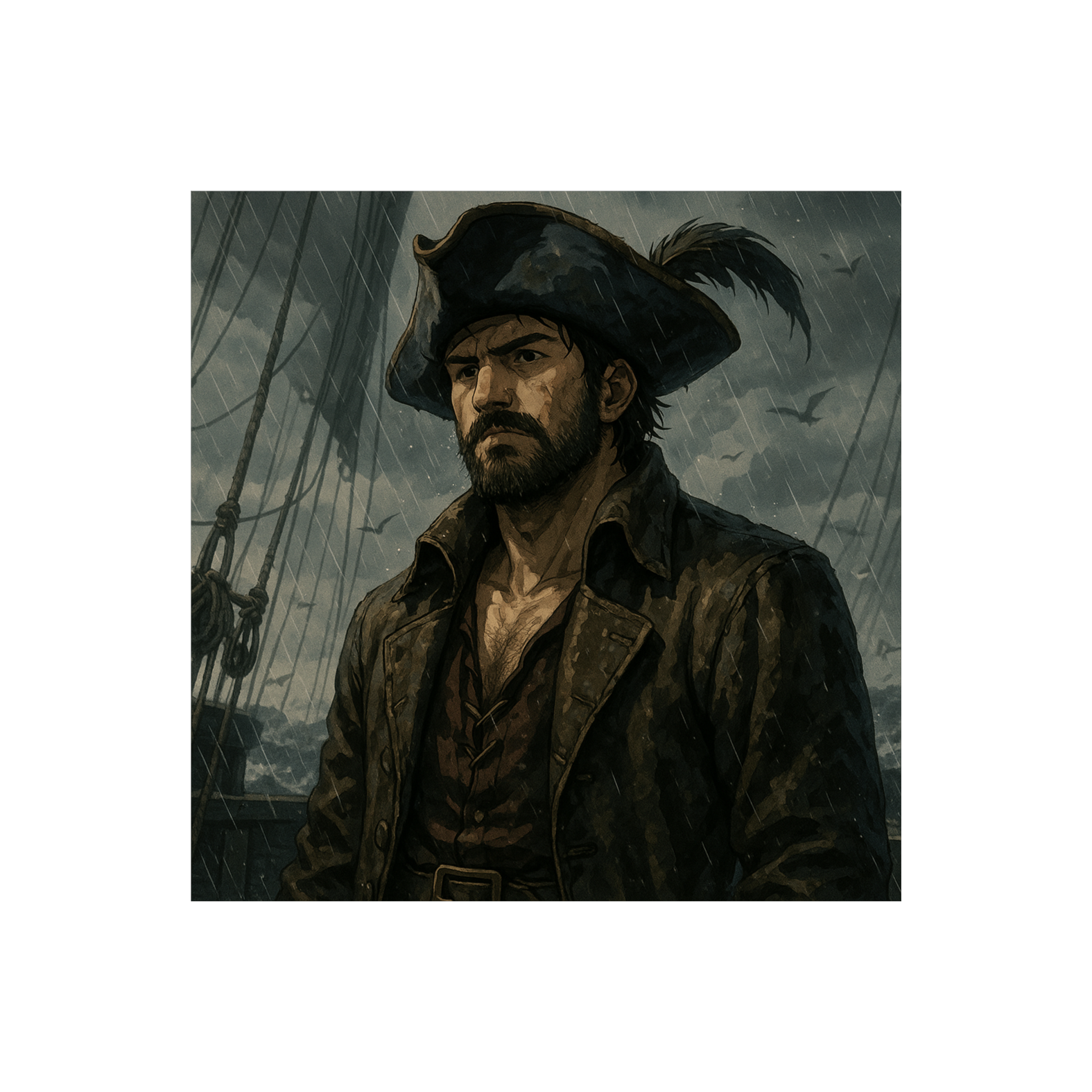 Authentic 18th-century sea shanty with darkwave undertones, performed mostly a cappella by gritty, weatherworn sailor vocals in a call-and-response format, Raw, unpolished harmonies echo with the rhythm of shipboard labor, but are laced with subtle reverb and minor-key dissonance to evoke unease, Shipboard percussion—stomping boots, creaking wood, rope pulls, and hand slaps—remains organic but is layered with low, droning textures and distant metallic echoes that suggest something unnatural stirring below deck, Traditional instruments like fiddle, concertina, and penny whistle are used sparingly, often processed through warbly tape flutter or drenched in cavernous reverb to sound otherworldly, Ambient textures include crashing waves, whispering winds, mournful gull cries, and ghostly hums from the deep, Occasionally, a pulsing low synth or analog bass swell creeps in beneath the surface like a sea monster’s breath, The performance feels communal, cursed, and ancient