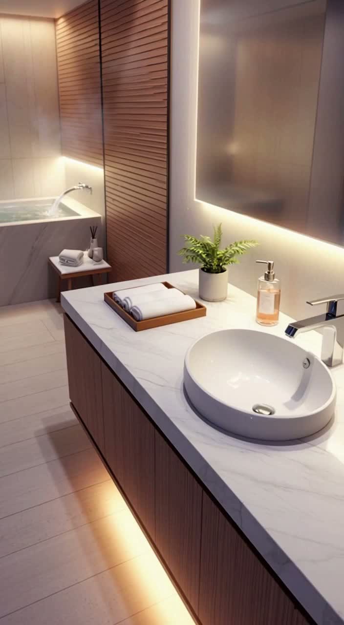 INSTRUMENTAL, lo-fi chillhop clean jazz BGM, 88→105→80 BPM elegant groove, pure instrumental, Rhodes Cm7-Fmaj7-Dm9, muted sax graceful lines, upright bass walk, crystalline shaker, faucet drip + hand soap SFX, towel ambience, washroom tile reverb, sophisticated relief serenity, tape warmth
