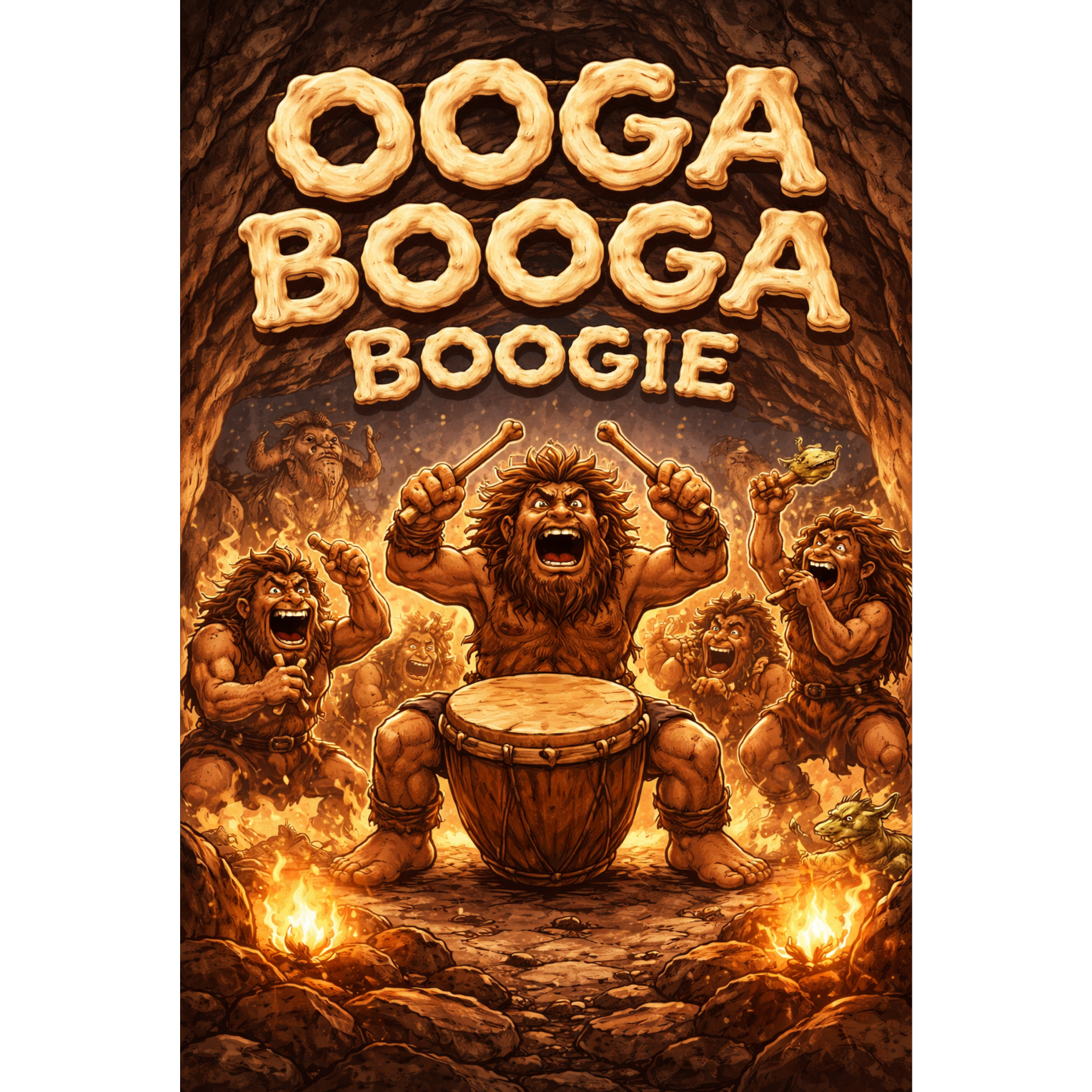 Whimsical caveman tribal chant, 108 BPM, low-pitched rough male vocals (gravelly, chest voice), mostly spoken/chant with minimal melody, simple 2–4 word hook lines, group shouts and call-and-response, heavy stomps and hand drums, bone/stone clacks, occasional throat-hum drones, jaw harp twang, short bone flute motifs, roomy cave reverb on chants, modern punchy mix but organic texture, comedic swagger, no pop harmonies, no clean singing, no long melodic notes