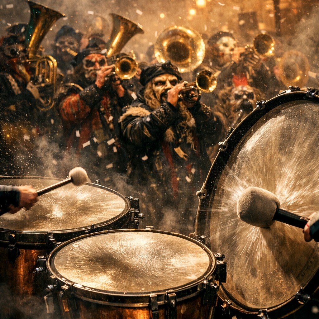 swiss timpani carnival musik, stadium percussion, brass assault, street-parade energy, loud and raw, upbeat, playful, 2/4 - 150 bpm, key g major, instruments: accordion lead, brass stabs (trumpet + trombone), tuba oom-pah bass, snare + kick polka groove, claps + stomp crowd, hurdy-gurdy dominant drone rhythmic chops (loud, gritty, wide, clearly audible