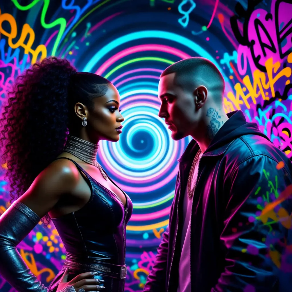 era: "2005â2015 (pop-R&B & urban era)", genre: "R&B, Pop, Urban, Hip-Hop Fusion", style: "Sensual and edgy, dynamic vocal interplay, minimalistic verses with punchy rhythmic sections, emotional storytelling with intimacy and tension, occasional rap/sung mix", vocals: "Female lead (Rihanna-style) with airy yet powerful tone, sultry delivery; male rap/spoken (Eminem-style) with sharp rhythmic articulation, emotional intensity, dynamic flow; harmonies layered subtly to enhance tension", mood: "Seductive, intimate, suspenseful, emotionally charged, night-time club/love vibe, with moments of vulnerability and raw honesty", instrumentation: "Sparse electronic beats, deep sub-bass, soft synth pads, minimal piano stabs, subtle hi-hat patterns, occasional atmospheric strings, layered percussion for tension, cinematic breakdowns", mastering: "masterpiece, modern urban polish, crisp high frequencies, deep yet controlled low-end, wide stere