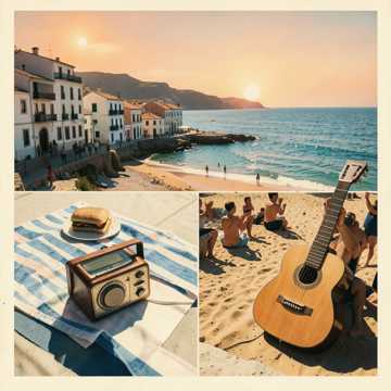 folk, Warm pop-folk with a nostalgic blues sway; nylon guitar and Portuguese guitarra trading licks over brushed drums and upright bass, Verses stay intimate and close-mic’d, with soft male vocals and subtle organ pads; chorus widens with group claps, tambourine, and stacked harmonies, Slide lines answer the vocal on turnarounds, and a brief mid-song break lets the guitarra sing before a final, big sing-along hook, blues, pop