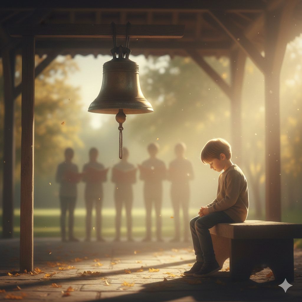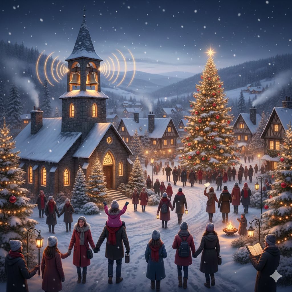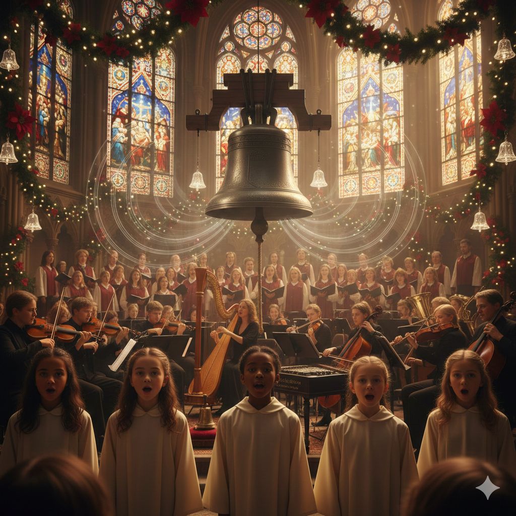 Ultra-high-fidelity sacred Christmas orchestral work, approx, 10 minutes, First full 60 seconds: bells only—church bells, tubular bells, handbells, glass bells, wide stereo, long natural decay, deep silence, no tempo grid, Shchedryk-inspired bell ostinato as harmonic spine, After 1:00, children’s choir enters unison, pure straight tone, intimate close mic, fragile and human, Gradual orchestral bloom: warm piano, harp, celesta, lush legato strings, flutes, oboe, clarinet, horns and low brass supporting harmony only, Bells remain present throughout, Mid-section: single child solo, almost spoken, answered by one distant bell, Emotional arc: stillness → warmth → compassion → reverence → transcendence, Final section: full choir and orchestra unified, rich harmony, bells strongest but never harsh, Ending: one distant bell, very long reverb tail, sacred space, Ultra-clean mix, cinematic depth, natural acoustics, extreme dynamic range, deep Christmas spirit
