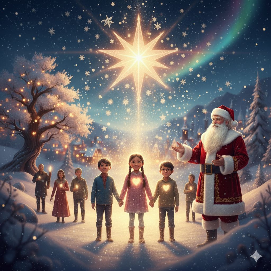 Ultra cinematic epic pop, 7-minute track with Christmas glow, Female vocal with crystal-clear diction, perfect articulation of every syllable, child-friendly, rounded vowels, no harsh consonants, Emotional arc from gentle storytelling verses to soaring choruses and climactic bridge, Lush orchestral strings, shimmering harp, celesta, soft bells, atmospheric pads, Gentle pop rhythm with sleigh bells, Ultra-wide stereo, immersive spatial reverb, high-resolution sound, Choir layers (adult + children), expressive breath control, radiant tone, Harp and celesta sparkle in verses; big orchestral lift in choruses; arpeggiated piano and shimmer pads in interludes, Bridge hits emotional peak with legato high notes, Warmth, innocence, wonder, cinematic depth fully conveyed, Every syllable clear and emotionally expressive, Maximum artistic potential, ultra-beautiful, emotionally transcendent