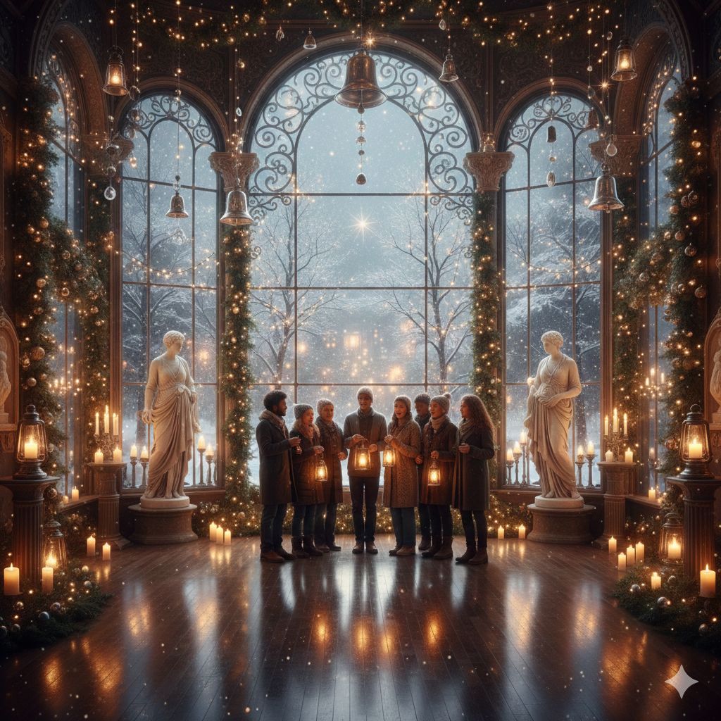 Ultra-high-fidelity 6-min Christmas gallery music, cinematic immersive S-grade hit, soft snow ambience, shimmering bells, harp arpeggios, lush strings, sparkling choir, subtle heartbeat sub-bass, ambient wind chimes, sleigh bells, twinkling snow FX, half-spoken half-sung airy vocals with vibrato, breath, grit, layered harmonies, stacked backup vocals, soaring lead, acoustic guitar arpeggio, synth leads, electric rhythm guitar, lo-fi percussion, tom fills, cinematic risers, sparkling reverb, stereo width, build: intro soft → intimate verses → pre-chorus lift → choruses full band → bridge half-spoken, reverb swell → instrumental solo → final chorus cinematic peak → outro fade ambient pad, distant bell, heartbeat, snow whispers, serene ending, visual: gallery lights, snow, candles, winter reflections, emotion: hope, warmth, magical winter wonder, vocals maximally expressive, angelic, emotionally breathtaking, all Christmas sounds layered perfectly