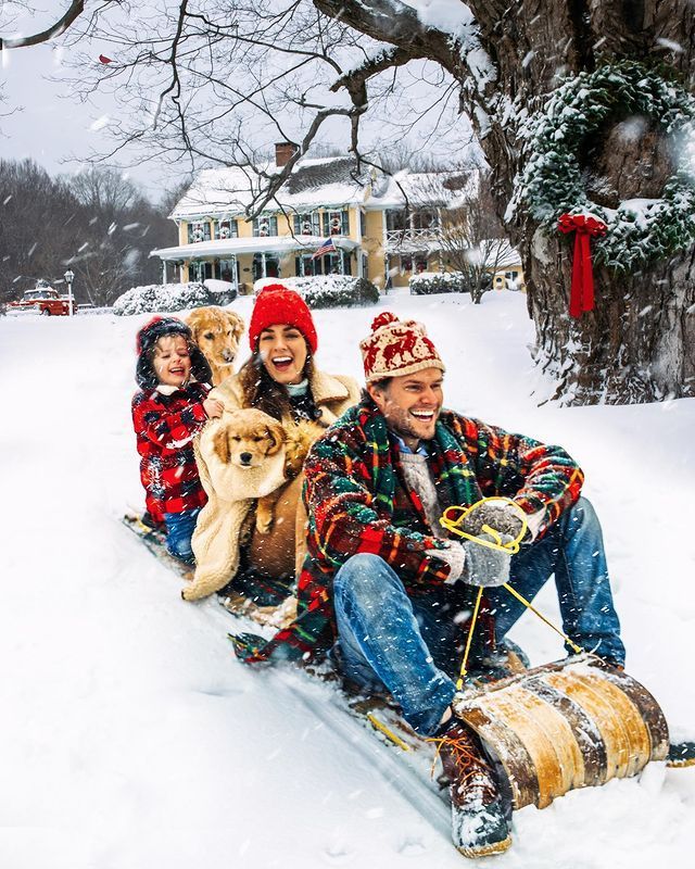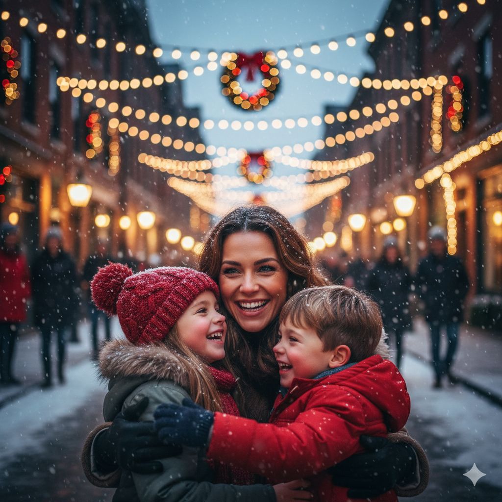 Visual: Snowy streets, Christmas lights, smiling family and friends