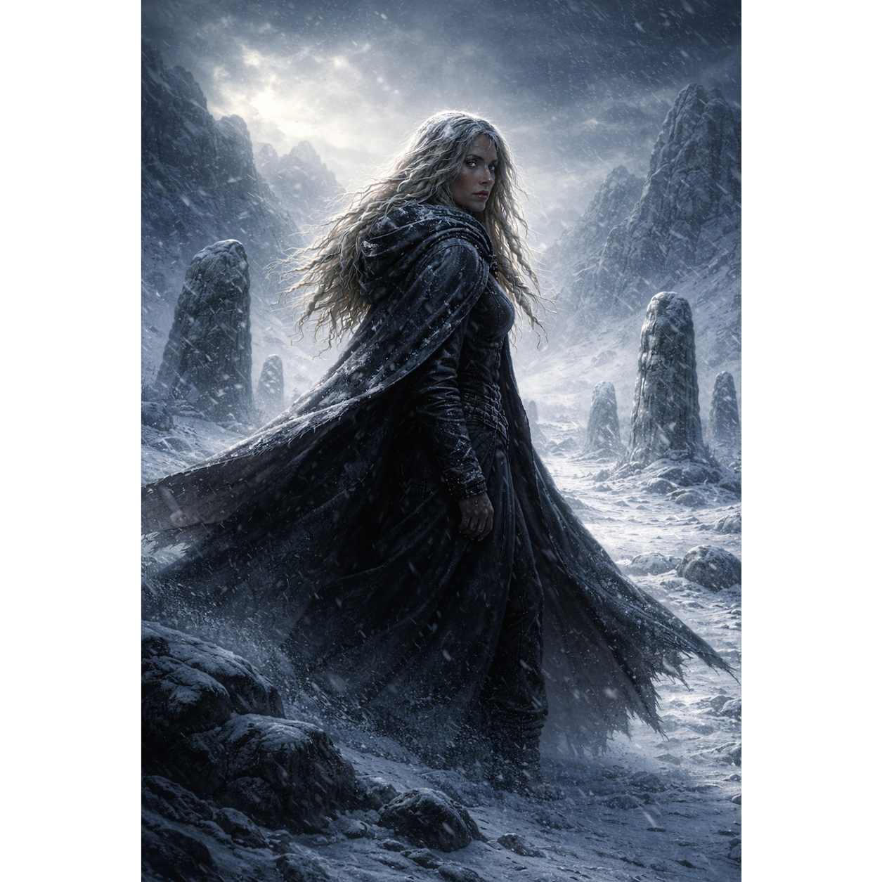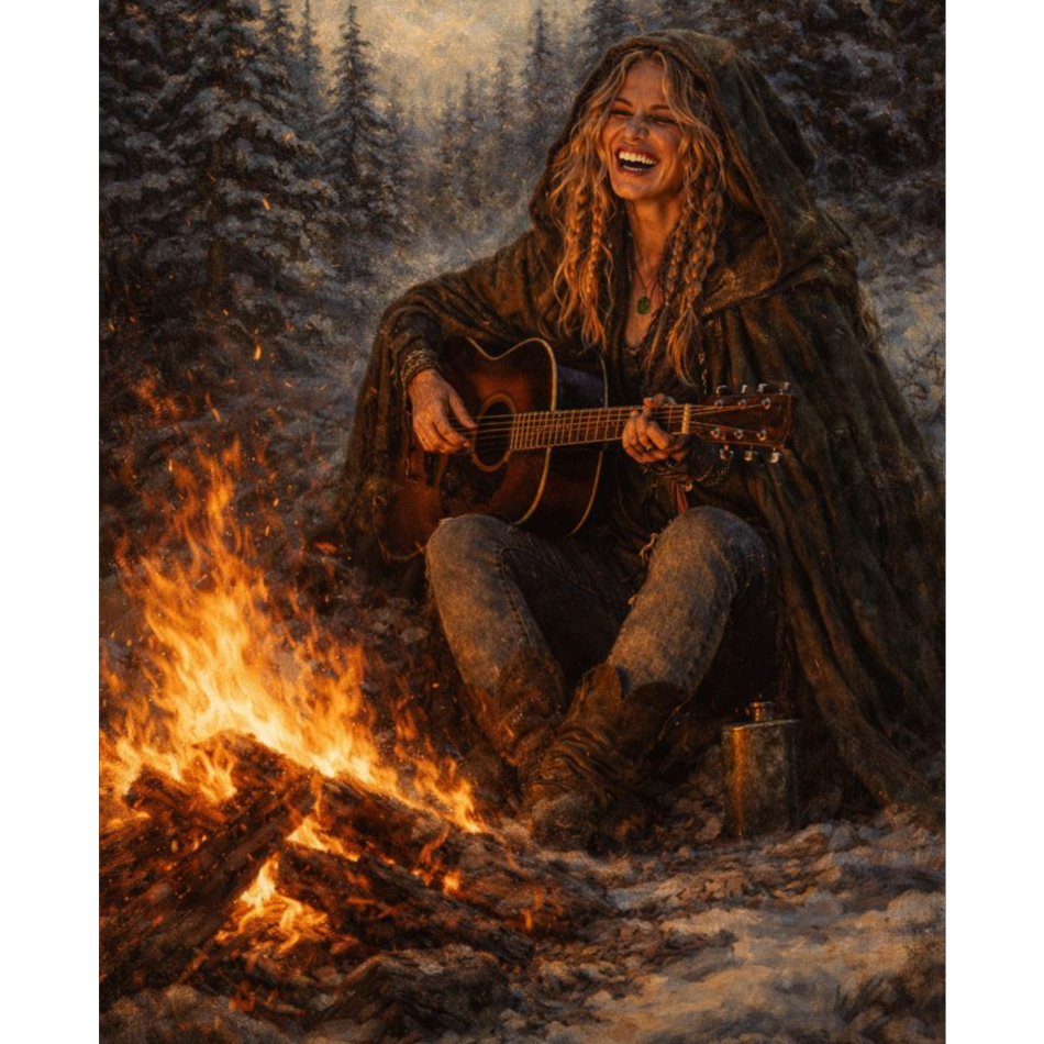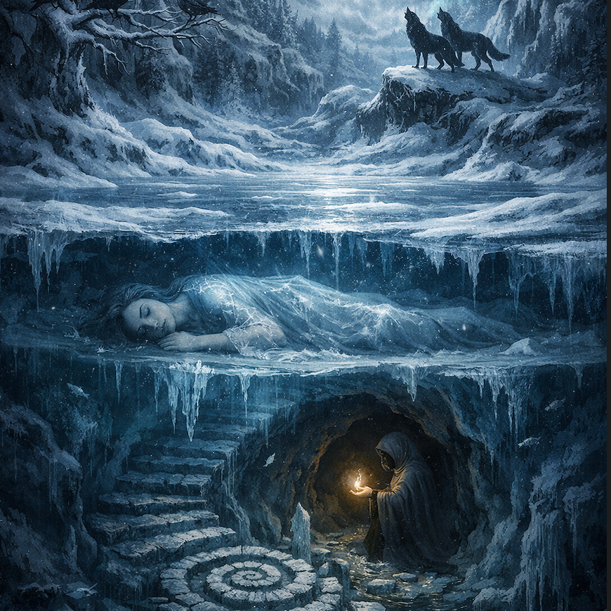 Dark folk / Northern mythic blues / Otherworld ballad, Slow to mid-tempo (72–84 BPM), Female vocal, low register, steady and restrained, slightly rough, emotionally controlled, Feels like a lone warrior walking between worlds, Sparse instrumentation: frame drum or stomp pulse, acoustic or baritone guitar, subtle drone, occasional low harmony, Cold atmosphere, frost and ash, ancient road energy, No choirs, no cinematic swells, no pop polish, Intimate, resolute, ritual-like