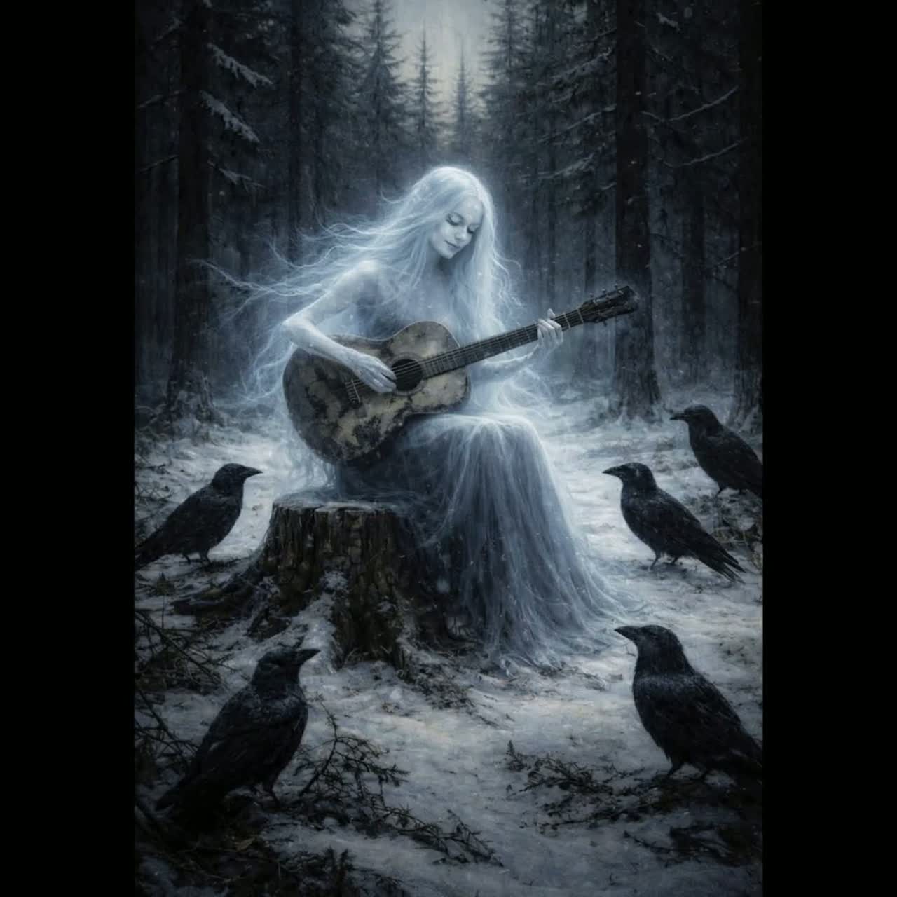 Dark Boreal Blues, acoustic slide guitar, slow stomping rhythm, haunting female folk vocals, cold atmospheric production, minor key, cinematic, Old Weird America, high-lonesome sound