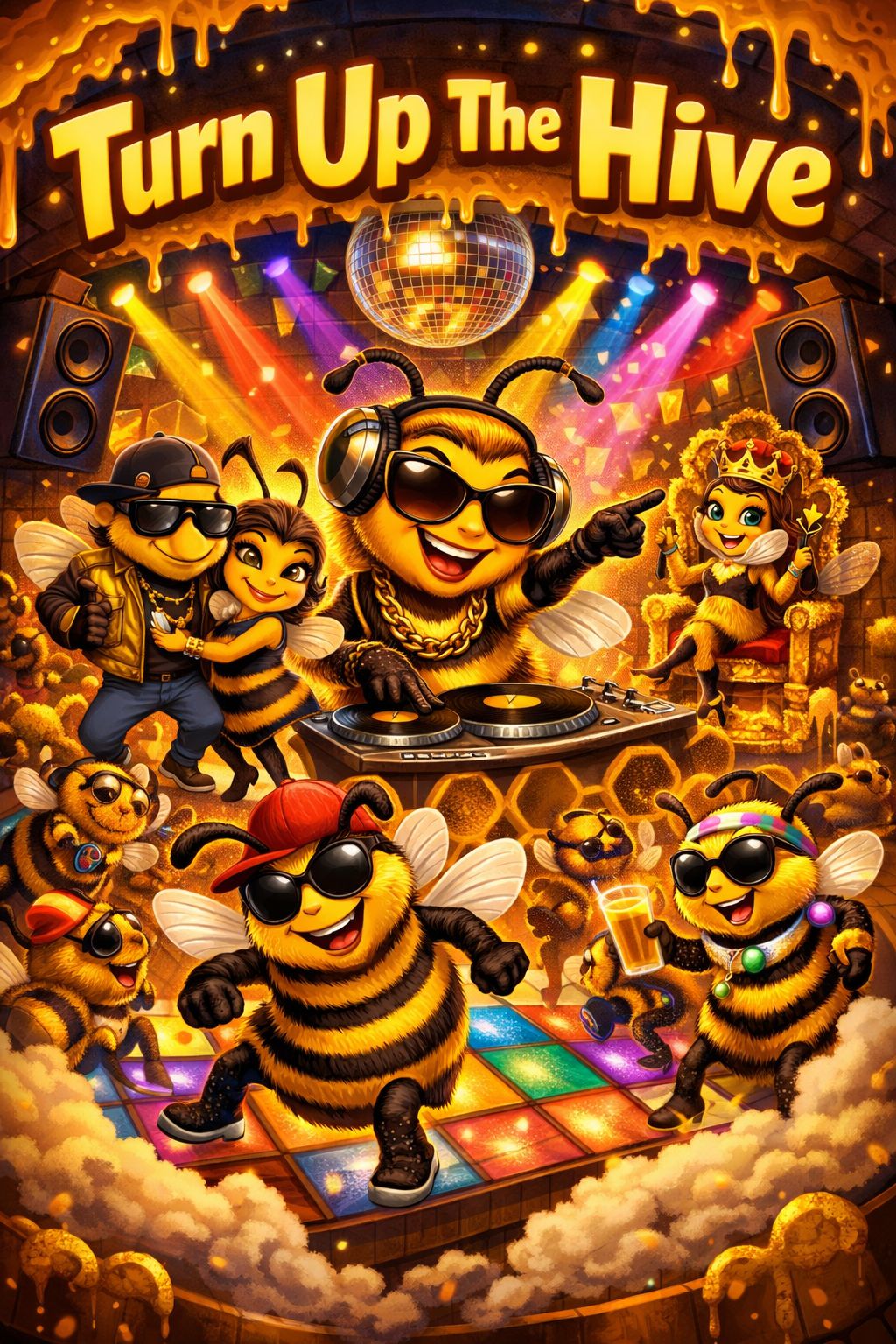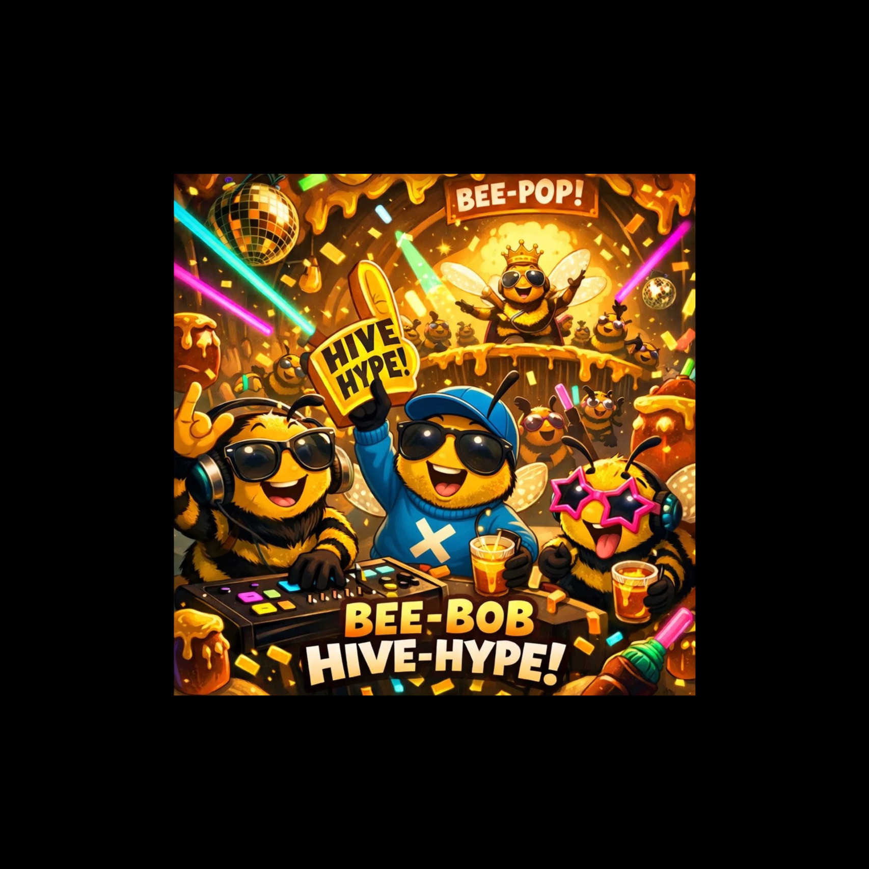 A high-energy electronic hip-hop dance track driven by thunderous club kicks, punchy layered drums, and powerful elastic basslines built for massive dancefloor impact, Bright buzzing synth arpeggios and shimmering trance leads create the sensation of a colossal beehive in motion, Rhythmic rap verses ride the explosive groove while energetic gang shouts and chant-style hooks ignite the crowd, Glitch accents, rising builds, and euphoric drops push the momentum forward, forming a hyper-danceable swarm atmosphere full of unstoppable drive, collective power, and festival-level energy
