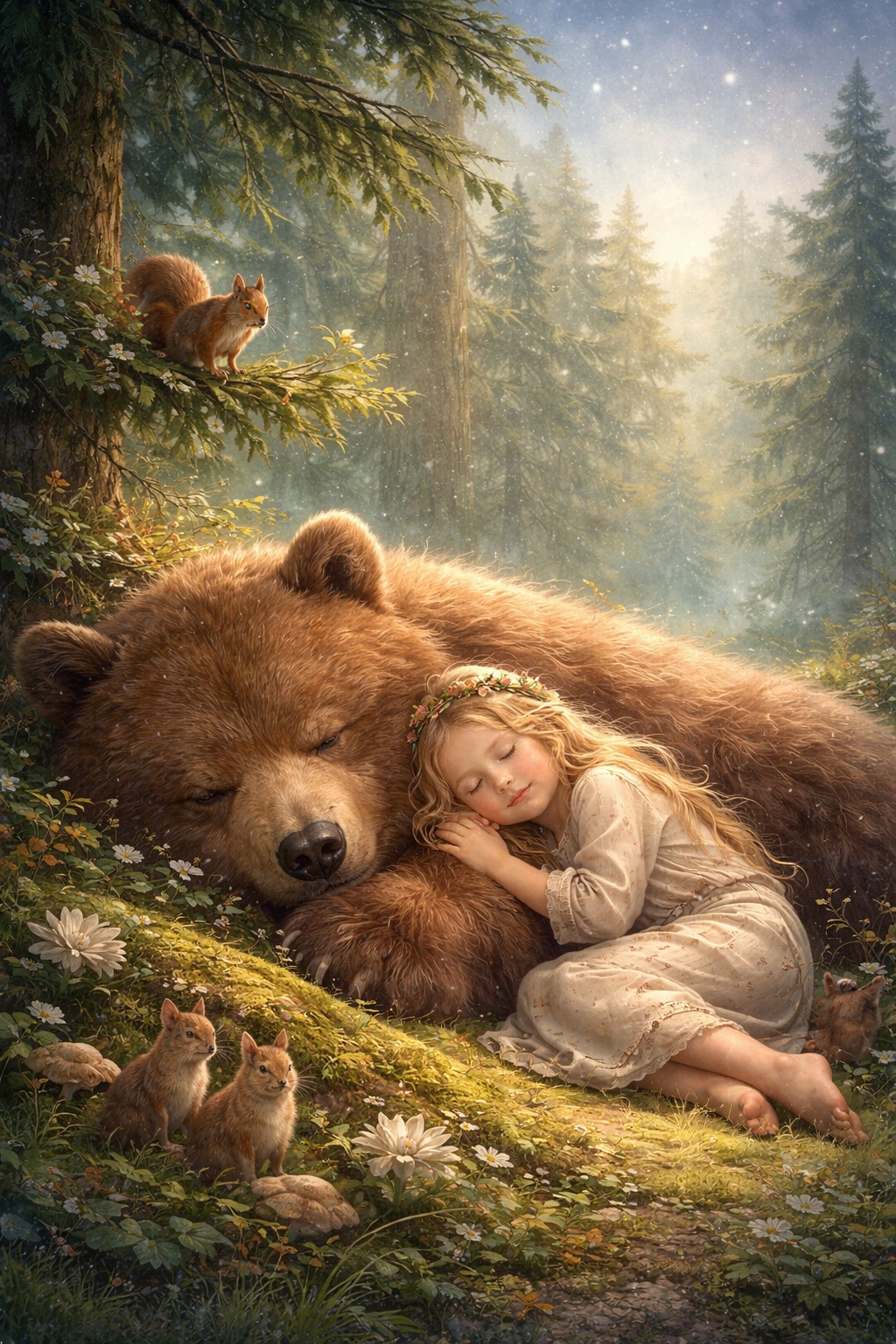 mystical forest new age pop, gentle rhythmic pulse, organic drums and hand percussion, warm airy female vocal, warm layered female choir with low and mid vocal layers, breathy harmonies, distant choir textures, lush evolving synth pads, deep atmospheric reverb, magical forest under a starry sky, celestial and peaceful atmosphere