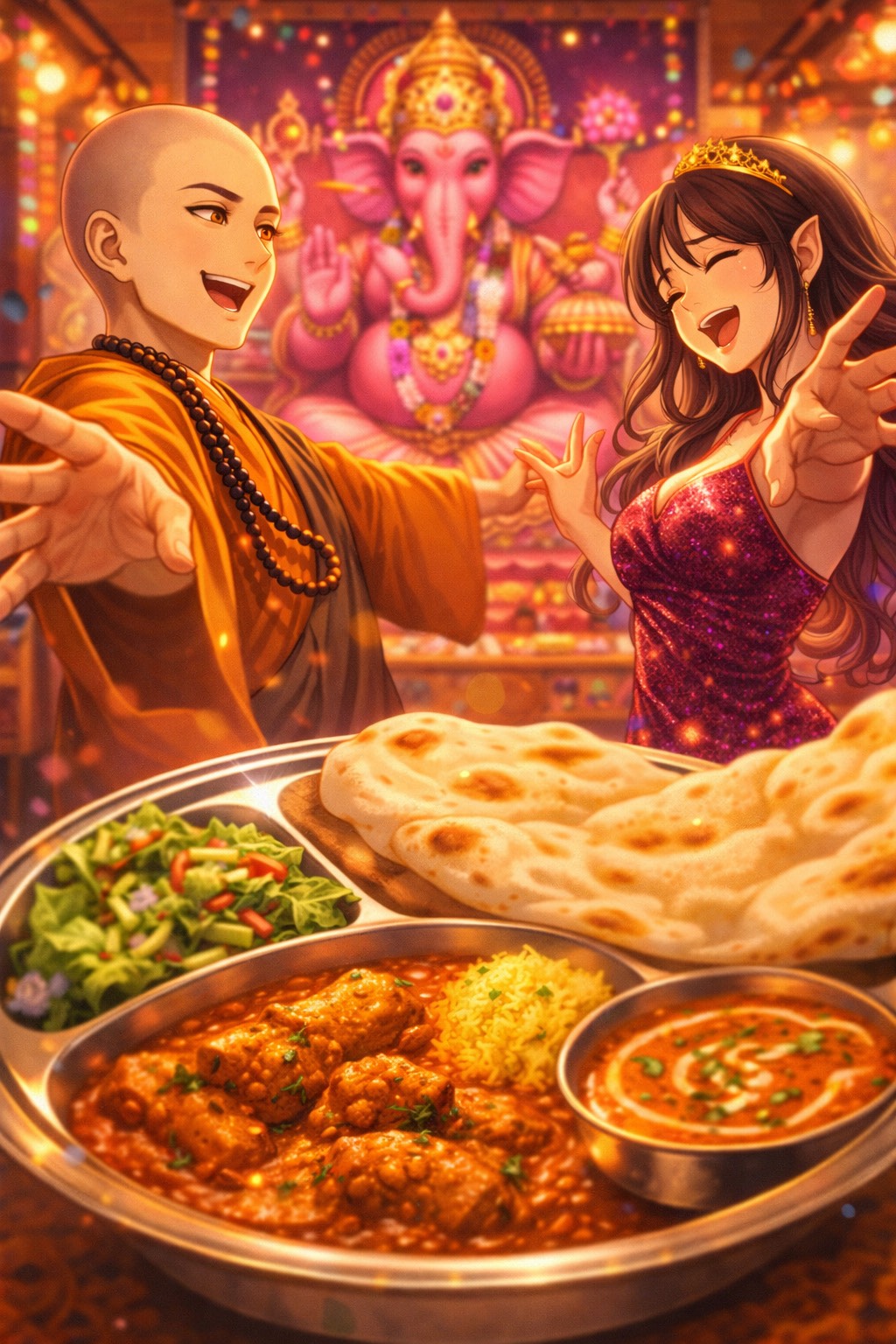 Bollywood Dance Explosion, Indian Festival Chaos, Sitar Lead Melody, Fast Tabla Grooves, Clapping Rhythms, Crowd Chanting, Call and Response Vocals, Playful Female Vocal, Energetic Male Vocal, Sudden Dance Break, Over-the-Top Cinematic Build, Colorful, Chaotic, Fun, Slightly Comedic Tone, Street Festival + Temple Fusion Atmosphere, Unpredictable Transitions, Stop-and-Go Rhythm, "Euphoria and Confusion at the same time"