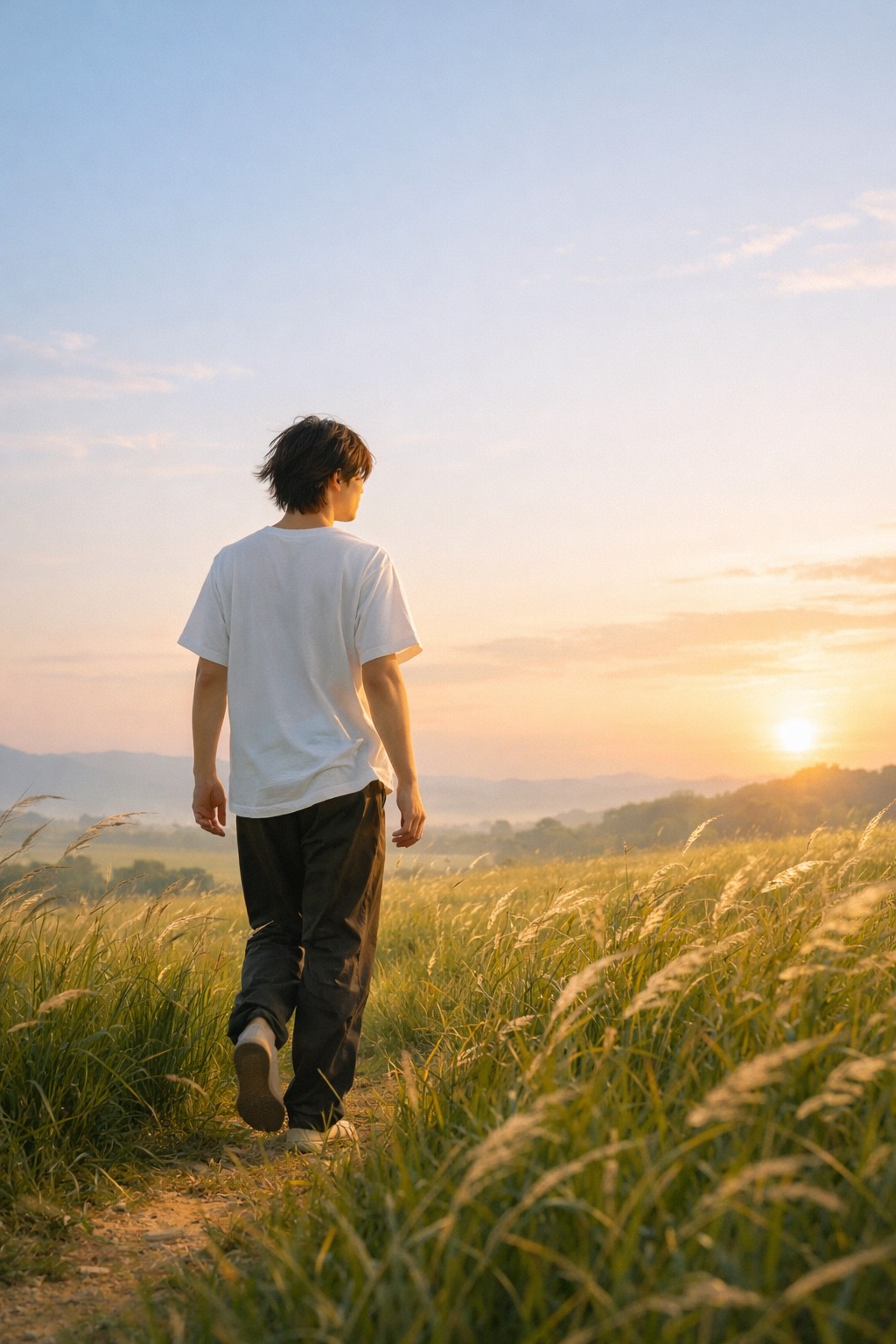 mid tempo airy funk ballad, light funky bass groove, soft drums with space, clean chorus guitar and shimmering synth pads, gentle expressive male vocal with soft falsetto and airy tone, uplifting emotional melody, open cinematic feeling like wind across a wide spring grassland, calm hopeful atmosphere, Rhodes-style electric piano