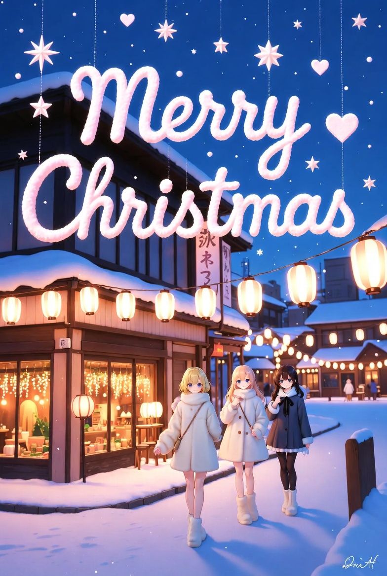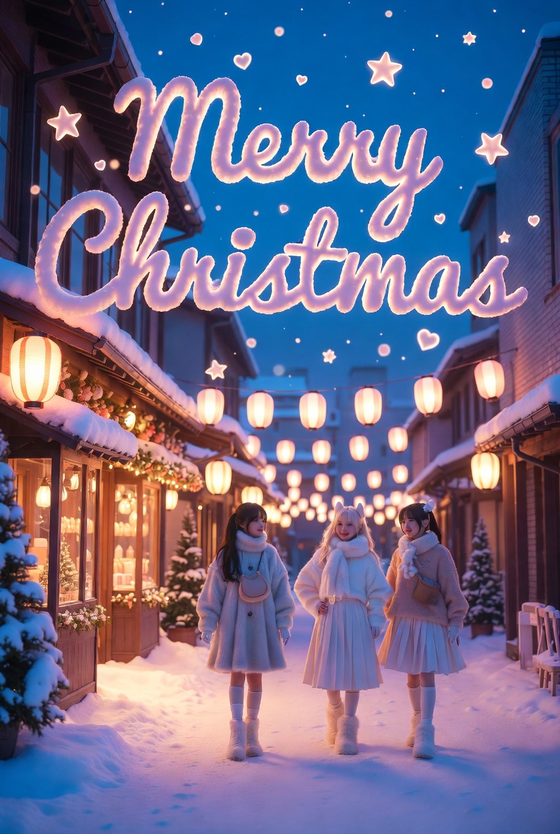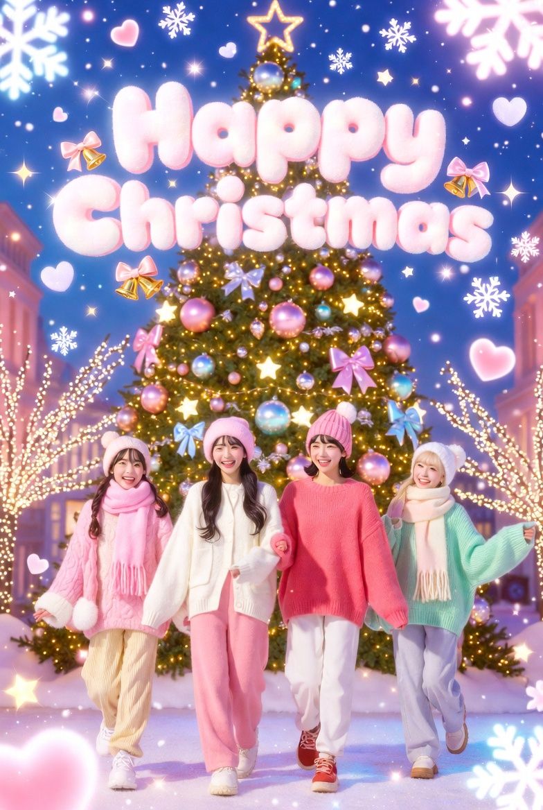 J-pop female multiple voices idol group Christmas song, ultra cute and joyful, bright winter holiday mood, upbeat and bouncy tempo, major key, very catchy and repetitive melodies, soft jingle bells and sleigh bell accents, bubbly synth leads, warm pads, playful bass, light electronic drums mixed with claps and snaps, cheerful chord progressions, adorable vocal delivery with smiles in the voice, layered group harmonies, cute call-and-response parts, sweet ad-libs, sing-along chorus designed to stick instantly in the head, cozy and magical Christmas atmosphere, feels like candy, snow, lights and happiness, energetic but soft, perfect for a top-hit Japanese Christmas idol song