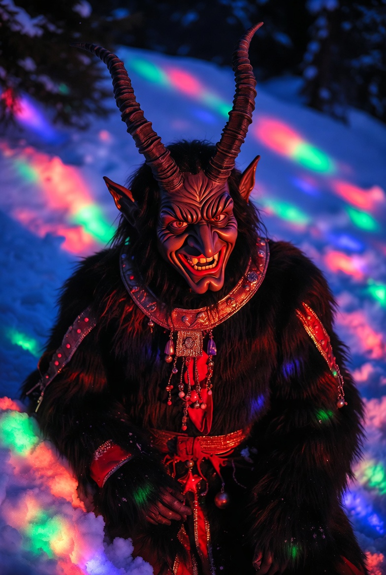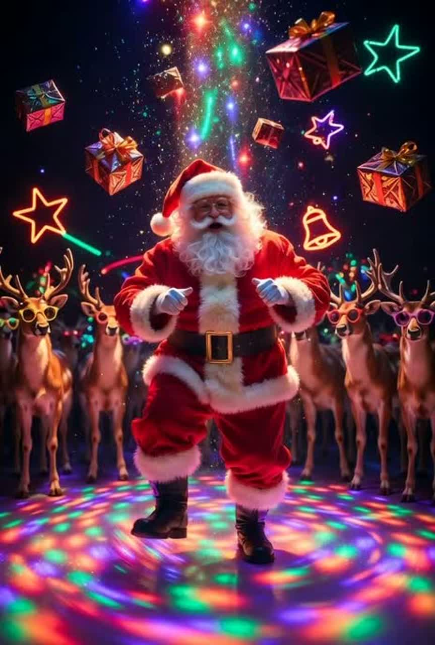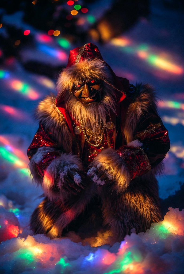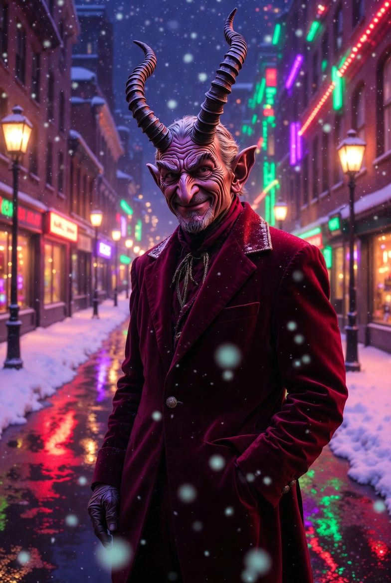 Festive Christmas night, winter holiday energy, seasonal sparkle, twisted holiday joy, playful menace, sarcastic and ironic mood, night chase feeling