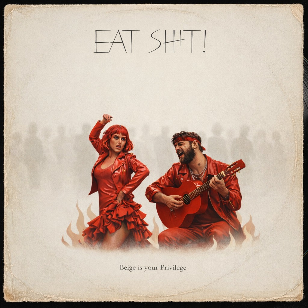 Authentic flamenco track with modern edge, expressive Spanish guitar (rasgueado, fast strumming), handclaps (palmas), foot stomps, strong vinyl crackle texture