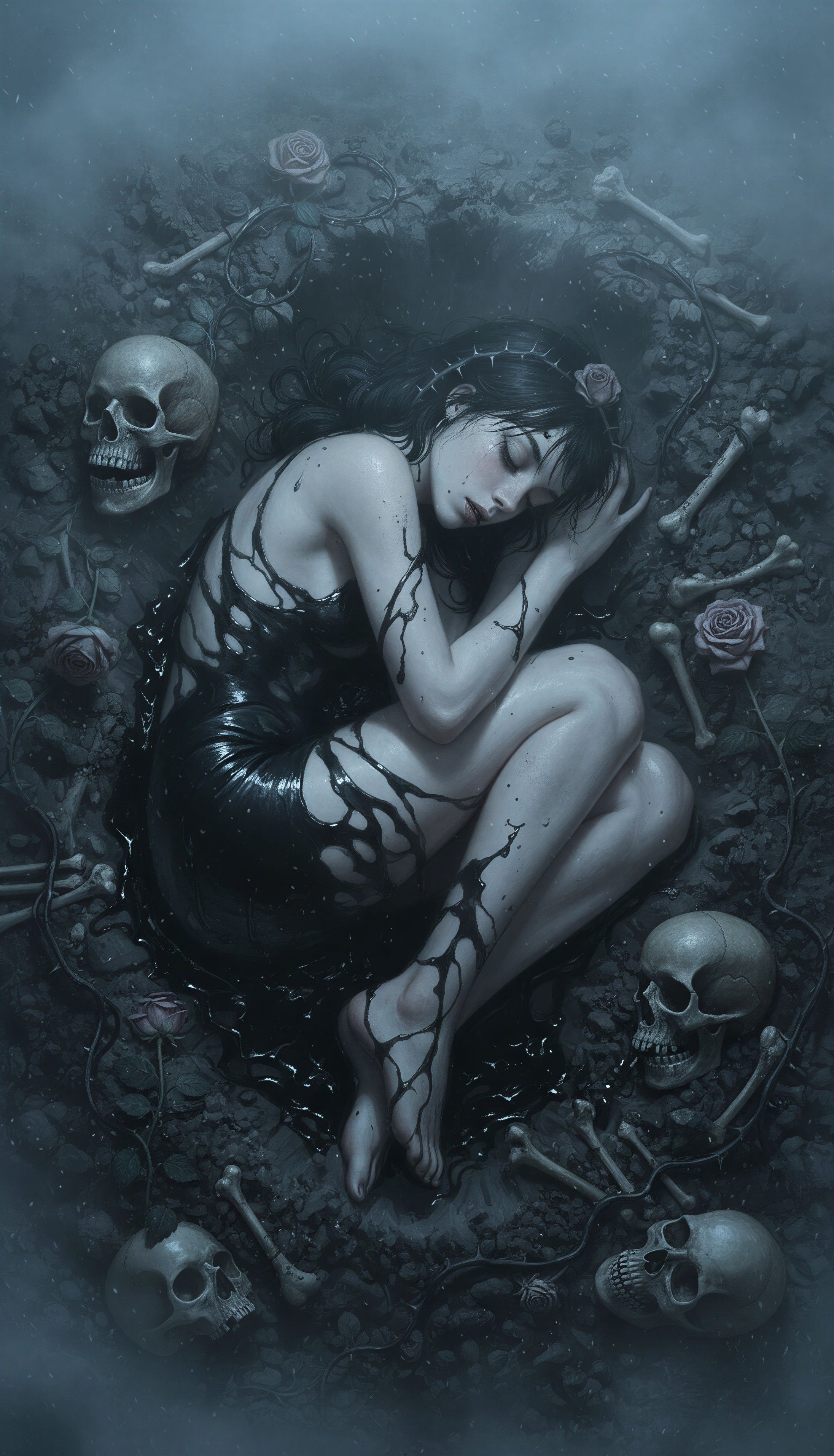A slow, hypnotic pulse anchors the track—deep, rounded kicks paired with delicate trap hi-hat rolls, breathing a subtle, seductive rhythm, The beat glides more than it stomps, drawing the listener into a trance, Experimental textures shimmer softly—granular whispers, reversed swells, glitch fragments used sparingly, as if memories dissolving into mist, The soundscape feels fluid and dreamlike, always slipping just out of reach, The bass is smooth and enveloping—dubstep-inspired subs with gently undulating wobbles and filtered sweeps, more caress than attack, wrapping the body in warm vibration, Breathy female vocals drift through—half-whispered, sigh-like phrases, elongated and soaked in reverb, rising and fading like the inhale and exhale of a secret, They seduce without ever fully revealing themselves, Synth pads are lush, foggy, and slightly detuned, giving the harmony a blurred, intoxicated