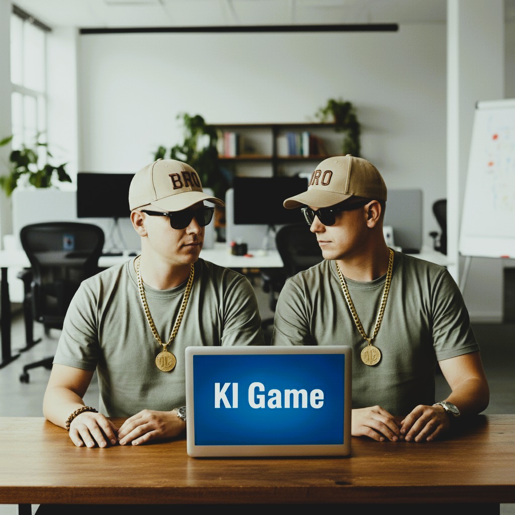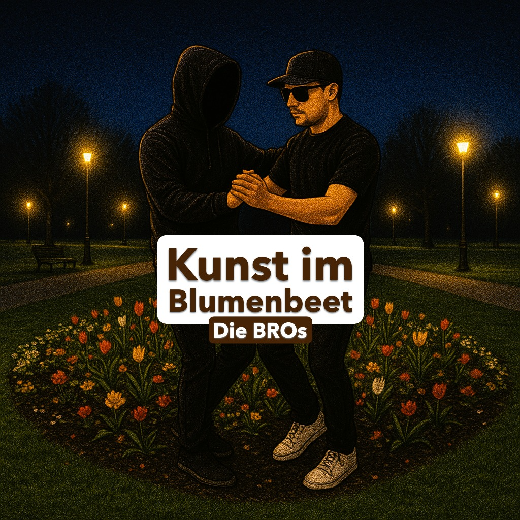 Modern German NDW and Synth-punk song with a 2025 electronic sound, Two raw male punk voices singing alternately and in duet, clear articulation, German vocals with modern effects, spoken-sung style, ironic storytelling, Tempo around 110 BPM, minor key, cool and futuristic mood, Deep sub bass, accentuated punky electric guitar riffs, modern synth pads, clean electronic drums, subtle sidechain, Minimalistic but club-ready production, Verses in an urban and melancholic atmosphere, Bridge in a hopeful, grateful mood, Chorus as a punk shout style, euphoric atmosphere