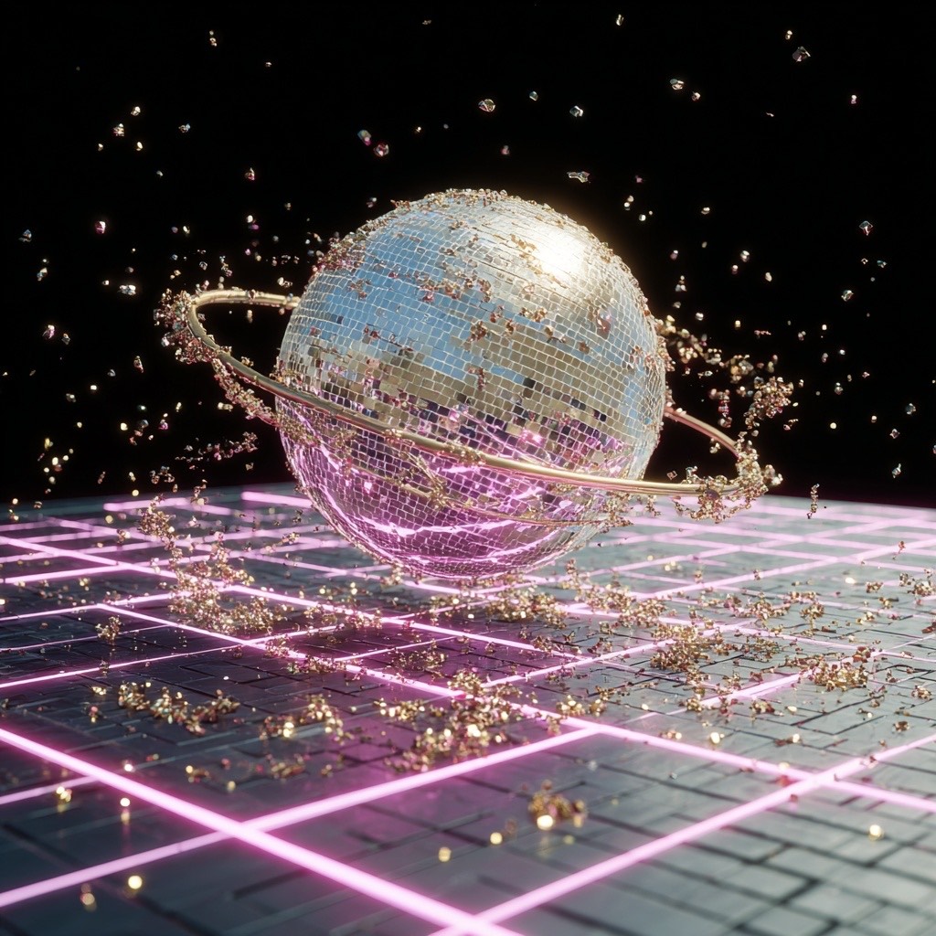 Dancing debris space nu-disco; trap; slow tempo (72 bpm); groovy basslines, crisp electronic percussion, nu-disco, spaced-out production with a steady, electronic, glitchy synth stabs, and warm, slow, funk, glitch, rap, post-glitch, head-nodding pulse, disco, atmospheric pads, male and female vocal samples chopped and pitched for rhythmic hooks, smooth