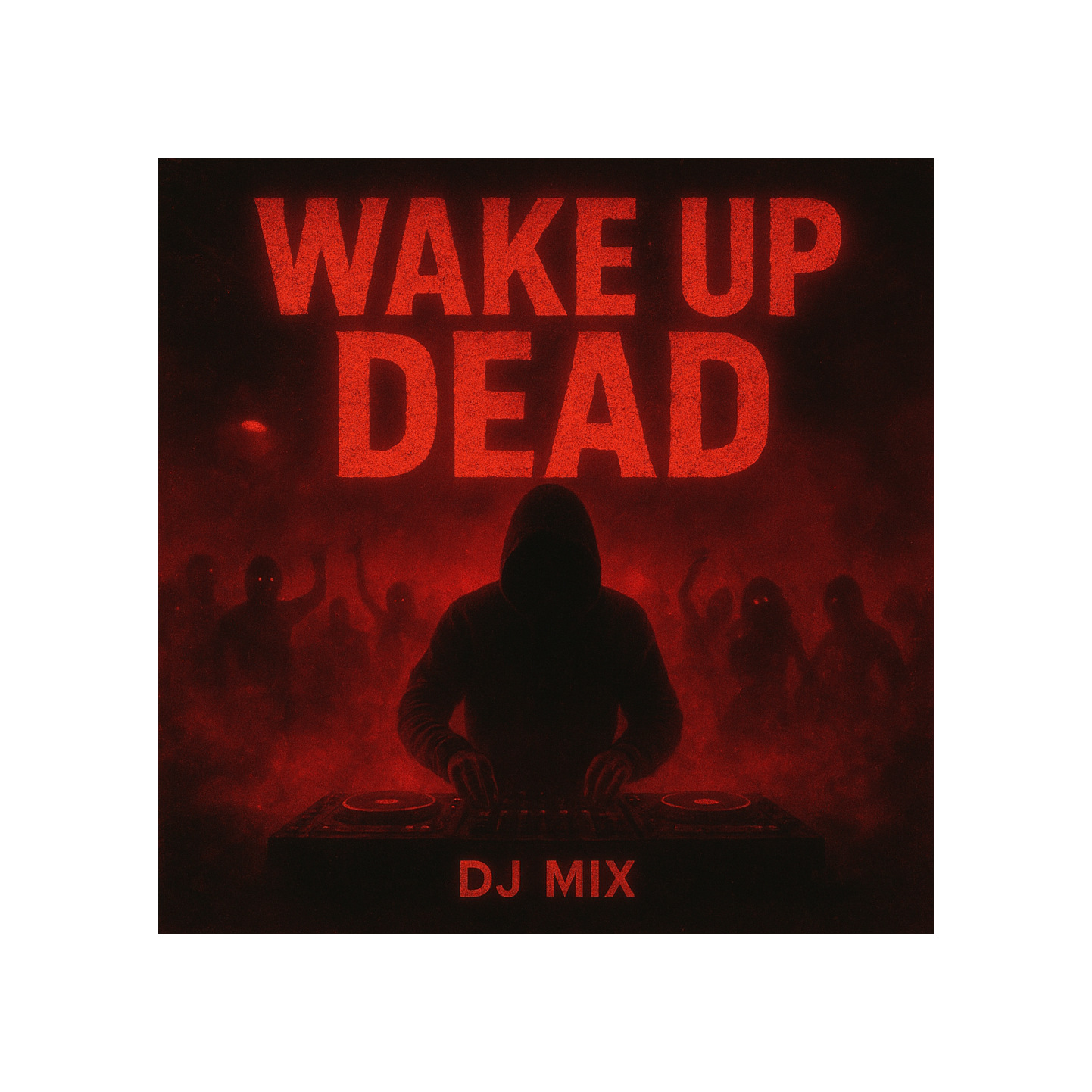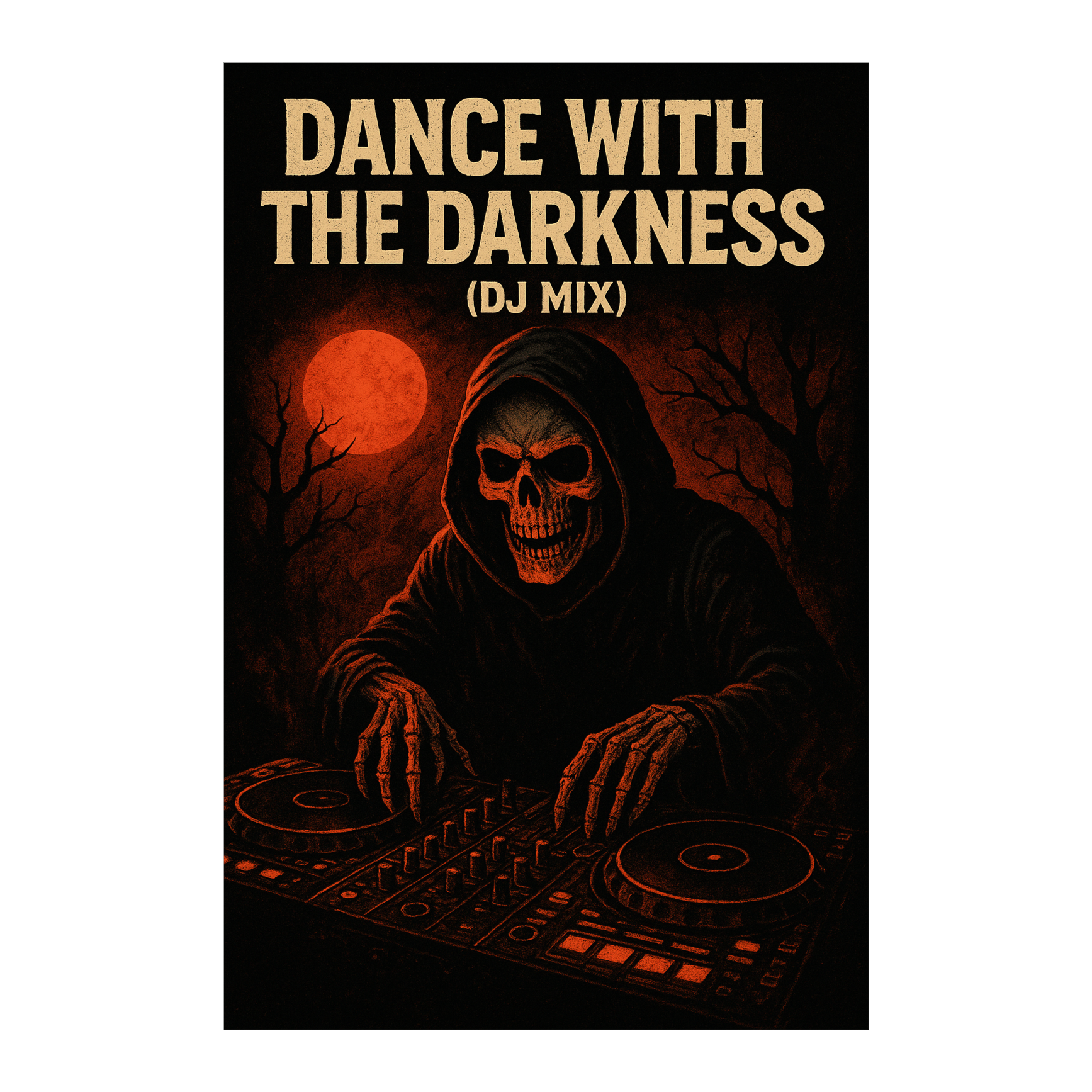 A DJ Mix driven by relentless electronic beats and deep, resonant bass lines anchors the atmosphere, Swirling synth textures intertwine with eerie, dissonant melodies, while sinister audio effects cut through, Ghostly whispers subtly drift below, intensifying throughout breakdowns, Fluid DJ transitions and mixing techniques maintain tension and momentum across the track