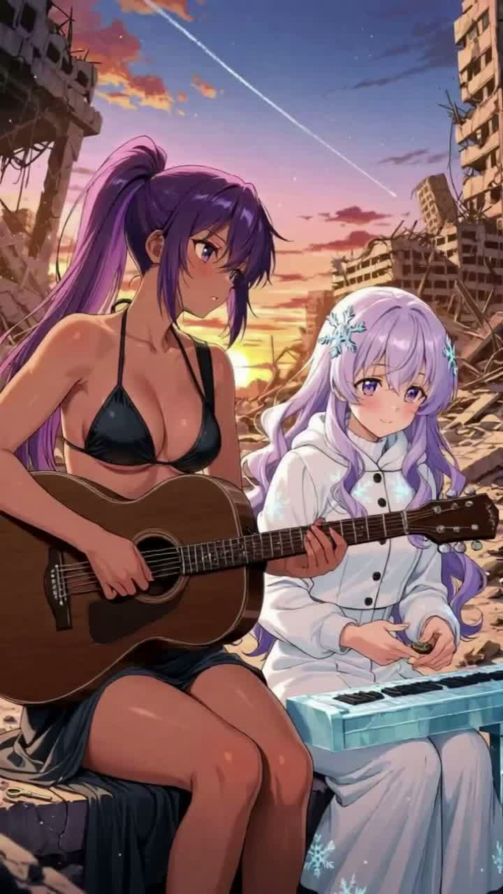 Vocal 1: powerful female rock/metal vocal with strong long notes, emotional shouts, airy ethereal lines, Vocal 2: cute and expressive female soprano with bright kawaii tone and emotional delivery, Band: