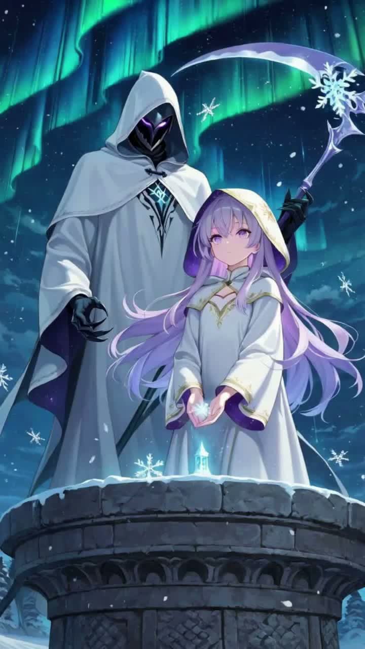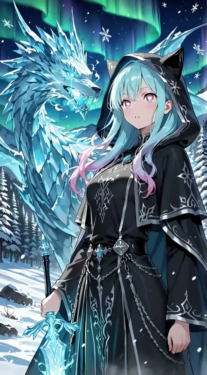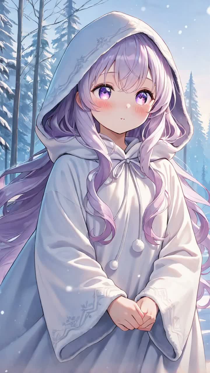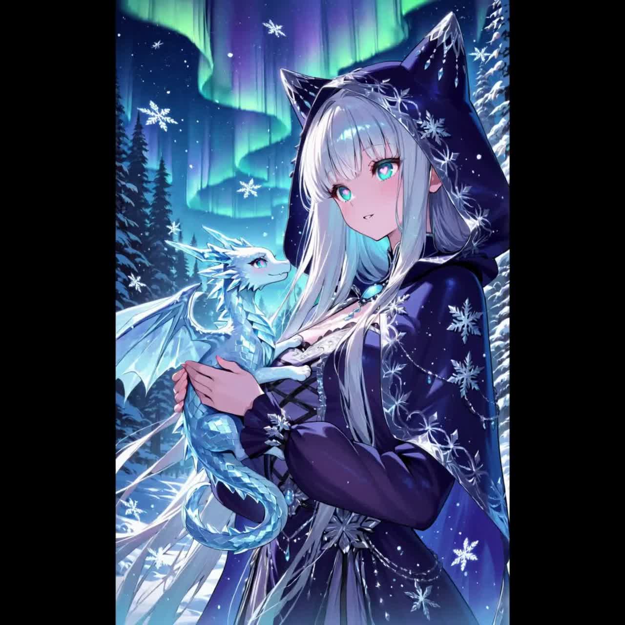 Atmospheric black metal track with heavy emphasis on tremolo-picked guitars and relentless blast beats, Cute anime-style girl vocals alternate between sweet melodic singing, ethereal whispers, and fierce screams, The music evokes snowy forests and crystalline echoes, combining furious intensity with mystical calm, Extended instrumental passages highlight fast tremolo riffs layered with icy reverb and continuous blast beat drumming