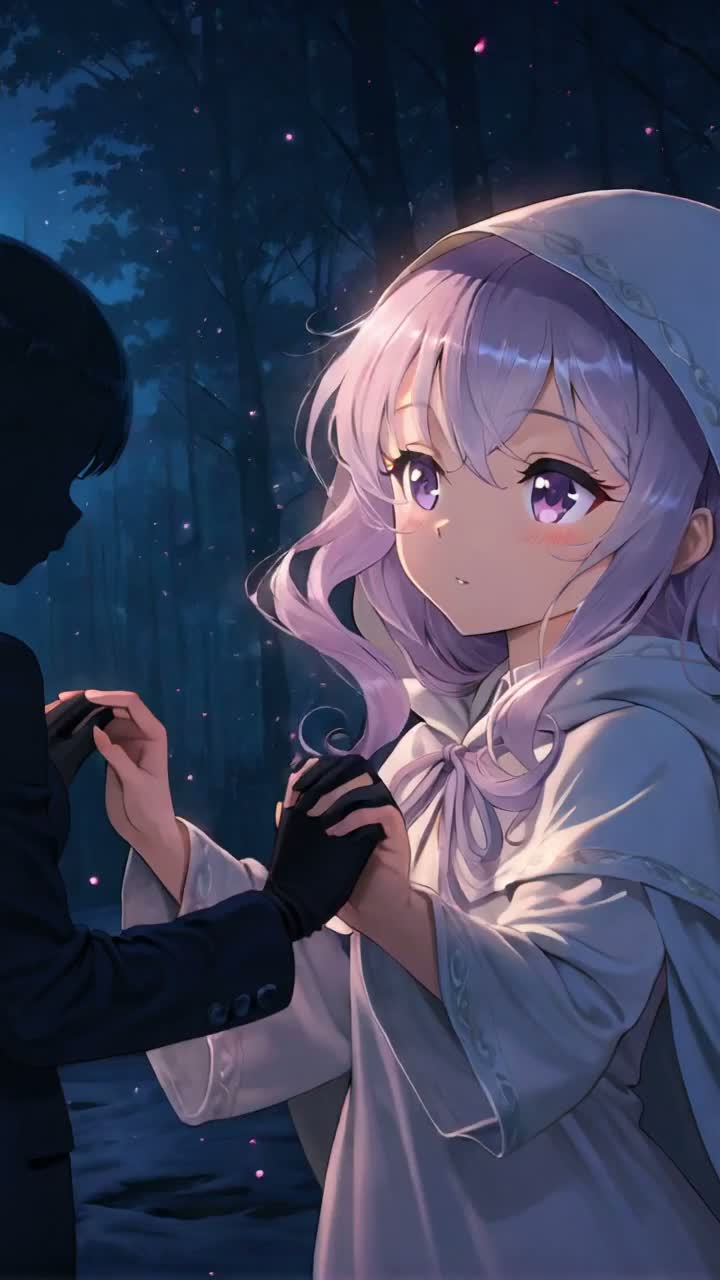 black metal, furious blast beat drums, relentless tremolo-picked guitar riffs, raw and fast with sharp sonic edges, Vocals: cute anime-style girl alternating between sweet melodic singing and ethereal whispers, accented occasionally by harsh black metal shrieks, Inspired by the "Crystal Forest story" side tale: mystical forest atmosphere, icy winds, ancient spirits, Composition intertwines aggression and fragile resonance, waves of ferocity and ethereal charm