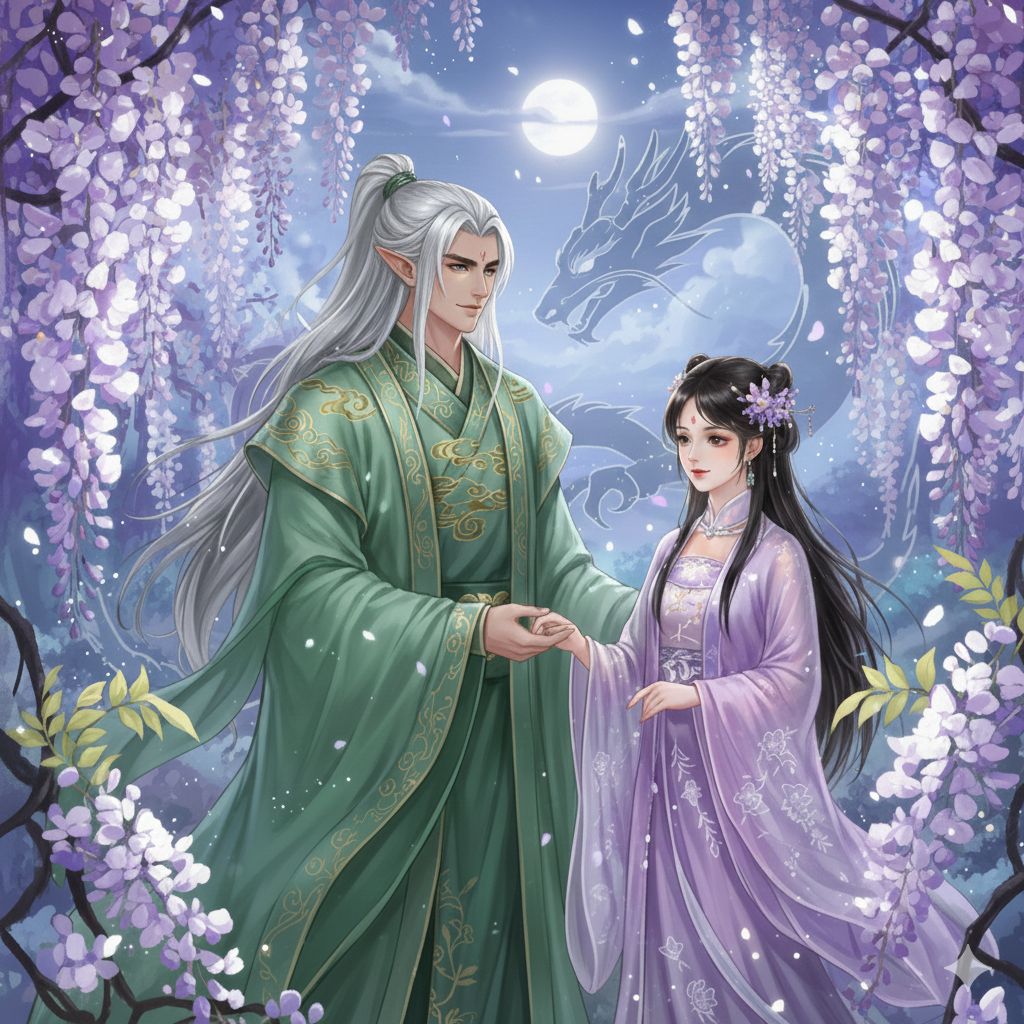 A dramatic romantic duet between a Chinese male vocalist and a Japanese female vocalist, The story: A divine Chinese dragon (male) was injured and saved by a gentle, pure Japanese wisteria-spirit woman (female), They fall in love but hide their true identities, They get engaged, reveal their true forms, and her family forbids the marriage, On the promised day, the dragon waits alone until she escapes and runs to him, The reunion is emotional and explosive with love, Style: cinematic, fantasy drama theme song, emotional, grand strings, KOKYU, erhu, koto, soft percussion, soaring chorus, female sings in Japanese, Male sings in Mandarin, Mood: bittersweet, passionate, mystical, destiny-bound romance, Include themes: waiting in the night, running toward each other, forbidden love, reunion, eternal vow, Vocal tone: tender, dramatic, expressive, Ending: powerful united chorus symbolizing eternal love