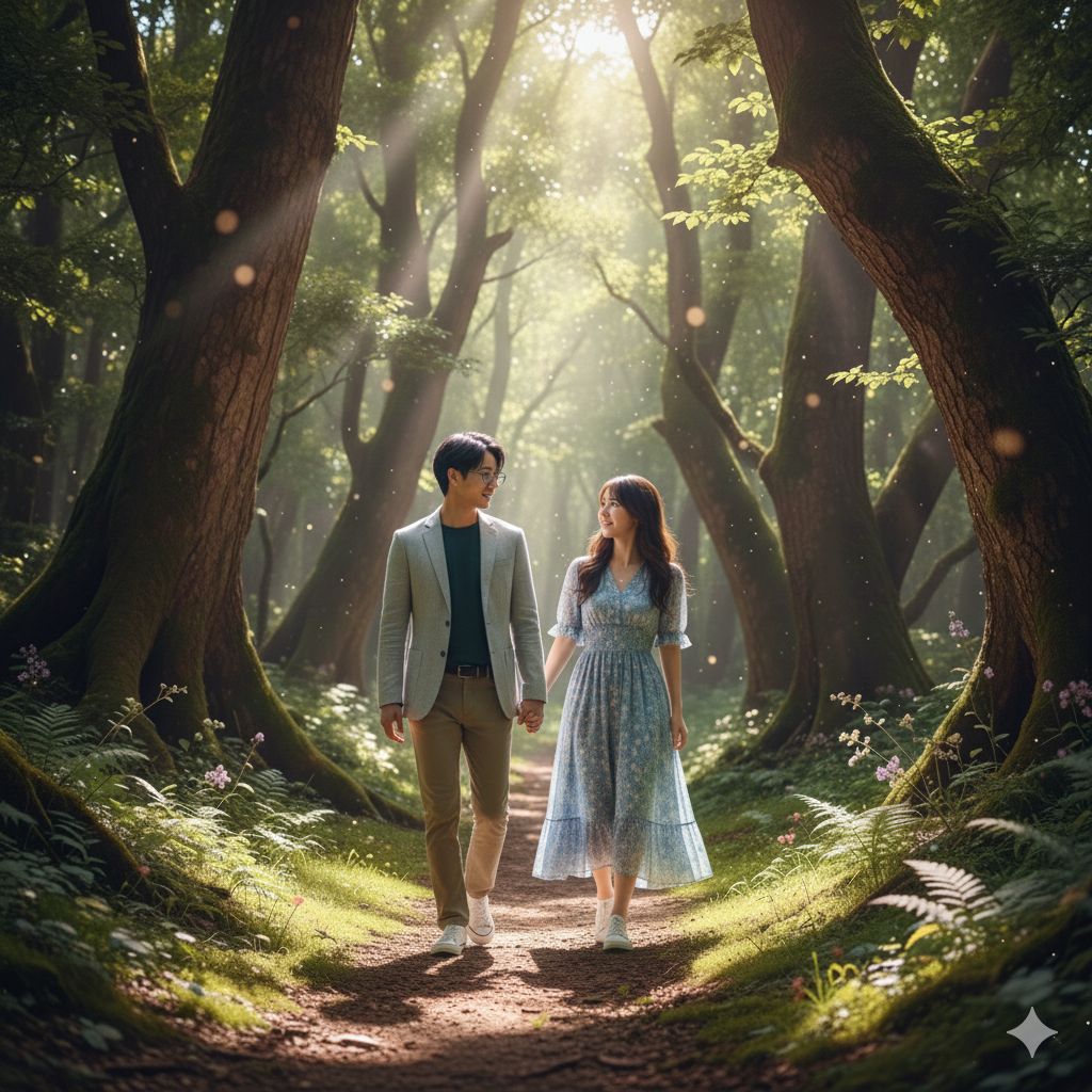 Vocals: Sweet, airy, and cute female voice; soft and gentle male voice, Tempo: Slow to mid-tempo (BPM 75–90), slightly bouncing, playful, Instruments: Soft piano, gentle strings, light percussion, subtle wind/chime effects, Mood: Dreamy, magical forest, warm and tender romantic vibe, nostalgic and heart-fluttering, Performance: Call-and-response style between female and male vocals; soft harmonies in chorus, Goal: Evoke the feeling of two young lovers sharing secret moments in a serene, magical forest, with pure and sweet emotions