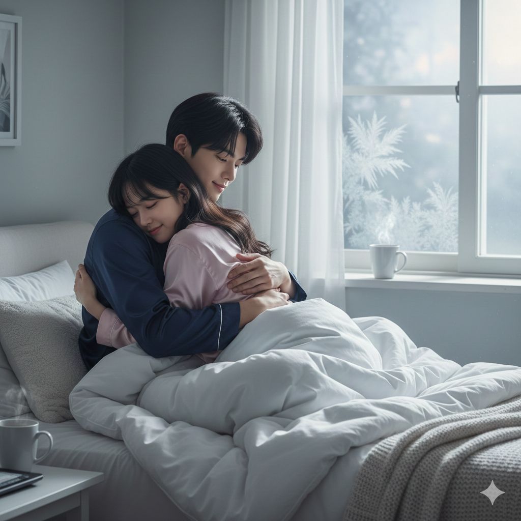 A cute, upbeat winter love song duet between a 20s Japanese girlfriend (sweet, adorable voice) and her younger Korean boyfriend (soft, gentle voice), Theme: a cold winter morning where the girlfriend cuddles into him in bed, and the sleepy boyfriend warmly pulls her into the blanket, She usually acts cool but becomes clingy only on cold days, which he secretly loves, Style: K-pop inspired, bright, warm, playful, fast tempo, with sparkling winter synths and light drums, Clear vocal separation: Japanese = girlfriend, Korean = boyfriend, Mood: cute, warm, romantic, cozy, couple sweetness