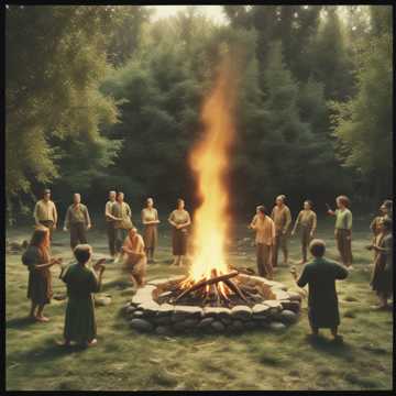 A bright, uplifting Celtic celebration song, Set by an ancient spring, villagers play harps, flutes, and bodhráns as they dance around a sacred fire, offering thanks to the elements, The melody flows like water, the rhythm beats like the heart of the earth, and the voices rise like the wind beneath a clear sky, Choir Voices, Male Vocals, Female Vocals, Celtic