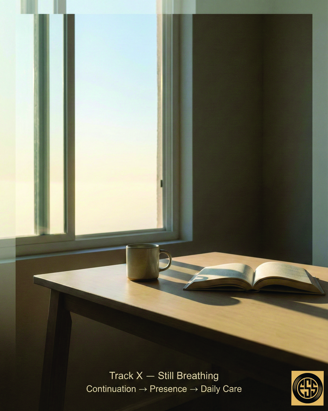 A minimalist ambient folk epilogue with strict vocal separation and intimate presence, Frankie sings as a close, unguarded male baritone—quiet, conversational, and grounded, Francine is a soft, clear female alto—warm, human, and reassuring, Verses are solo-only and alternate male then female, Choruses are sparse, with gentle call-and-response and light harmony, never swelling, Instrumentation is minimal: soft acoustic guitar, faint piano or harmonium pad, subtle room tone, distant morning birds, and occasional breath sounds, No percussion until the final moments, where a barely audible pulse suggests continuity, Tempo is slow and natural, like waking up without an alarm, The atmosphere feels like morning after meaning—presence without performance, care without ceremony, life continuing quietly