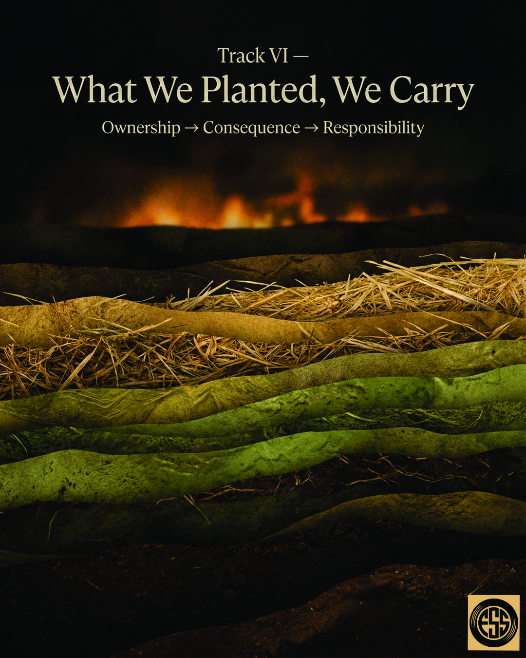 A grounded Afro-folk agrarian meditation with strict vocal separation, Frankie sings as a low, weathered male baritone—steady, burden-aware, and compassionate, Francine is a clear, warm female alto—observant, guiding, and emotionally steady, Verses are solo-only and alternate male then female, Choruses begin in call-and-response before resolving into restrained male–female harmony with clear spatial separation, Instrumentation reflects settlement and time: frame drum with heavier pulse, muted djembe, low acoustic guitar, subtle upright bass, and wooden flute used sparingly, Rhythms feel deliberate rather than free, evoking planning, seasons, and responsibility, Tempo is moderate and grounded, No urgency, no accusation, The atmosphere is reflective and humane—acknowledging the cost of certainty, the weight of planning, and responsibility as a natural extension of care, not a punishment